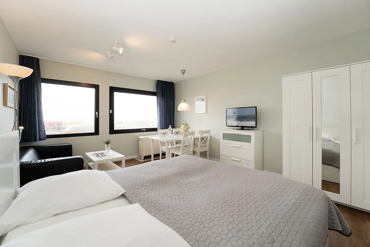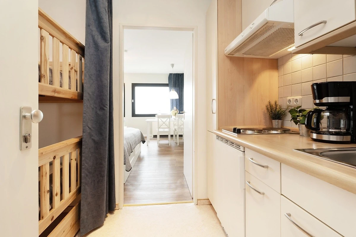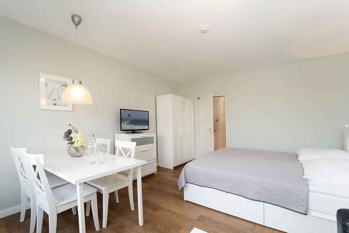 Herzlich Willkommen im Appartement Heimathafen! Hier können Sie wunderbar die Seele baumeln lassen. Die Ferienwohnung besticht durch ihre wunderbare Lage - umgeben von Wasser. Im hellen Wohn-/Schlafbereich befindet sich ein gemütliches kleines Sofa, ein schöner Esstisch sowie ein bequemes Doppelbett (180x200 cm) zum Träumen. Durch die grossen Fenster haben Sie praktisch von überall aus einen tollen Meerblick. Öffnen Sie die Fenster, um dazu noch die frische Meeresluft zu atmen und um den Möwen zu lauschen. In der kleinen, offenen Kochnische mit Herd, Kühlschrank, Kaffeemaschine und Wasserkocher können Sie sich gut selbst verpflegen. Für Kinder steht separat, zwischen dem Küchenbereich und dem innenliegen Badezimmer mit Badewanne mit Duschfunktion, ein Etagenbett zur Verfügung. Fussläufig befinden sich kleine Läden für die Brötchen am Morgen, ein Waschsalon und Lokale, um bei Tee und Kuchen den Tag zu geniessen, den Sonnenuntergang an der Uferpromenade und die letzten Kiter zu beobachten.