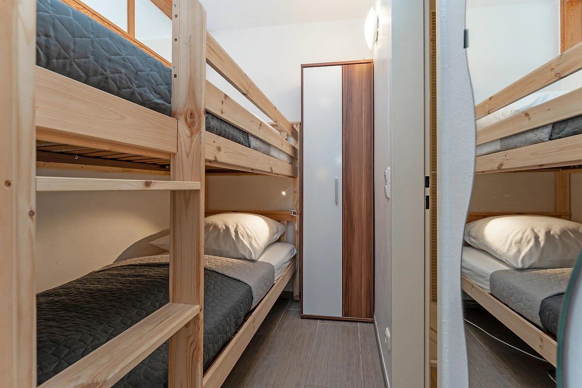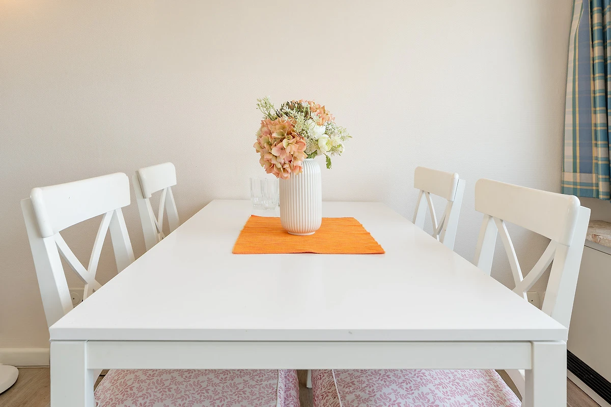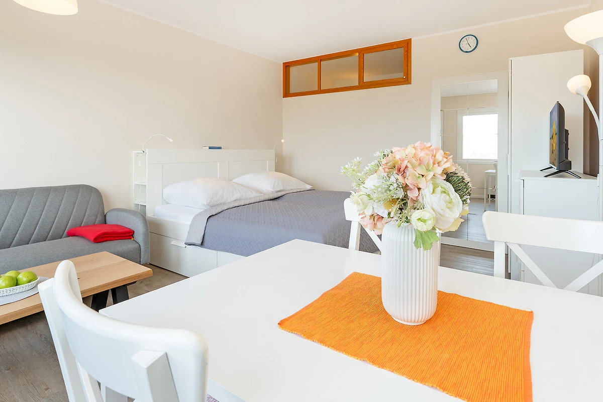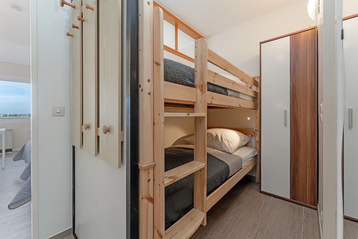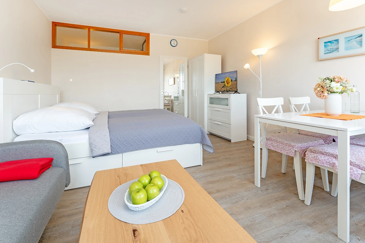 Bequem mit dem Fahrstuhl erreichen Sie Ihr Urlaubsdomizil. Im gemütlichen Wohn-/ Schlafraum befindet sich ein bequemes Doppelbett (180x200 cm) zum Träumen sowie ein Esstisch und ein kleines Sofa mit TV-Gerät. Das Etagenbett steht zwischen der kleinen, aber gut ausgestatteten Küche und dem Badewannen-Bad. Das Besondere ist sicher die Lage dieser Ferienwohnung, weil Sie von Wasser umgeben ist. Unser Tipp: Öffnen Sie das Fenster, um die frische Meeresluft zu atmen und um den Rufen der Möwen zu lauschen. Praktisch: Fussläufig finden Sie kleine Läden für die Brötchen am Morgen, einen Waschsalon und Lokale, um bei Tee und Kuchen den Tag zu geniessen oder abends den Sonnenuntergang an der Uferpromenade und die letzten Kiter zu beobachten.