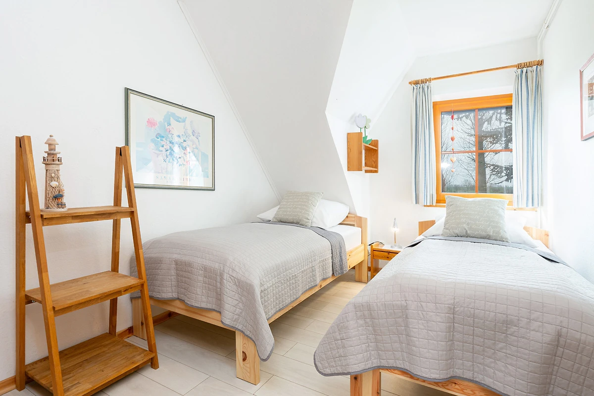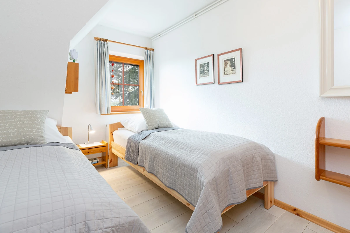 Schlafzimmer 2: 2 Einzelbetten (je 90x200 cm), Verdunkelung: Gardinen, Kleiderschrank, kein Platz für ein Babybett vorhanden