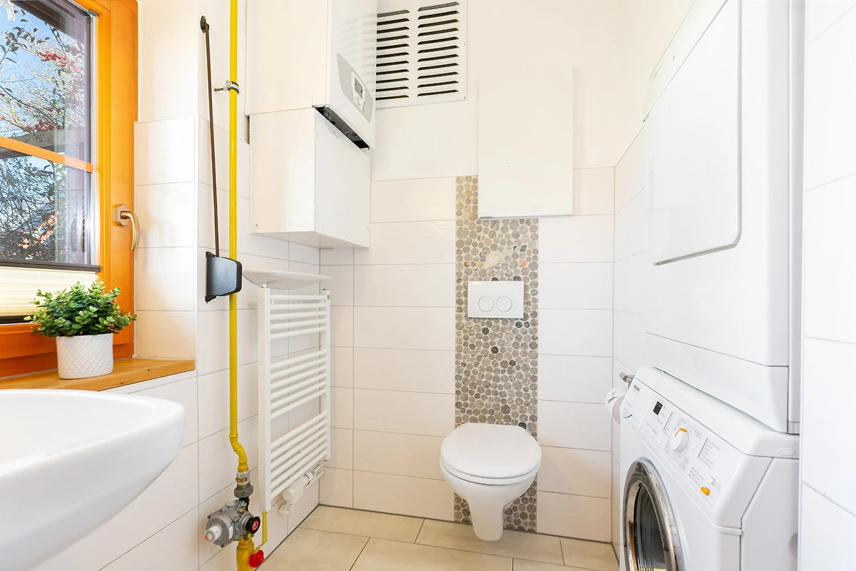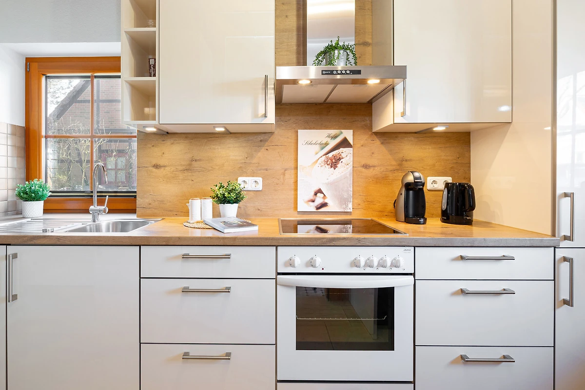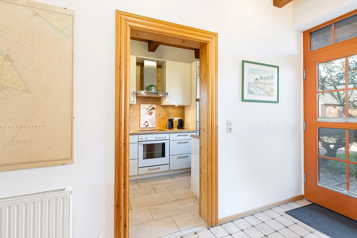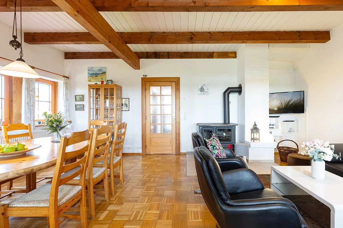Im Erdgeschoss befindet sich ein grosszügiger Wohnbereich mit Sitzecke und Essbereich. Der Blick geht über die Terrasse mit Gartenmöbeln in den grosszügigen Garten, über Felder und Wiesen mit freier, unverbauter Sicht Richtung Fehmarnsundbrücke. Der rustikale Kaminofen ist im Wohnbereich ein schönes Highlight: Er spendet an kühleren Tagen wohlige Wärme. Ein grosser Fernseher mit Sat-Receiver, Blue-Ray-Player, Radio- und CD-Player sorgt für die richtige Atmosphäre und das richtige Programm. In der sehr gut ausgestatteten Küche finden Sie z. B. Spülmaschine, Herd mit Cerankochfeld, Backofen, Kühlschrank mit Eisfach, Mikrowelle und Kaffeemaschine. Ein Gäste-WC mit Waschmaschine und Trockner, eine Abstellkammer für Ihre Utensilien und ein grosser Flur mit Garderobenschrank sind zusätzlich vorhanden.