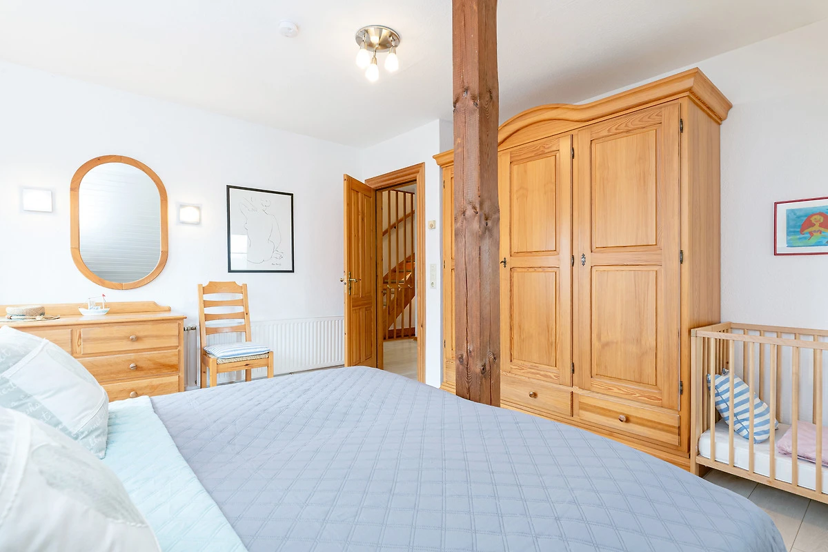 Schlafzimmer 1: 1 Doppelbett (190x200 cm), Verdunkelung: Gardinen, Kleiderschrank, Babybett vorhanden