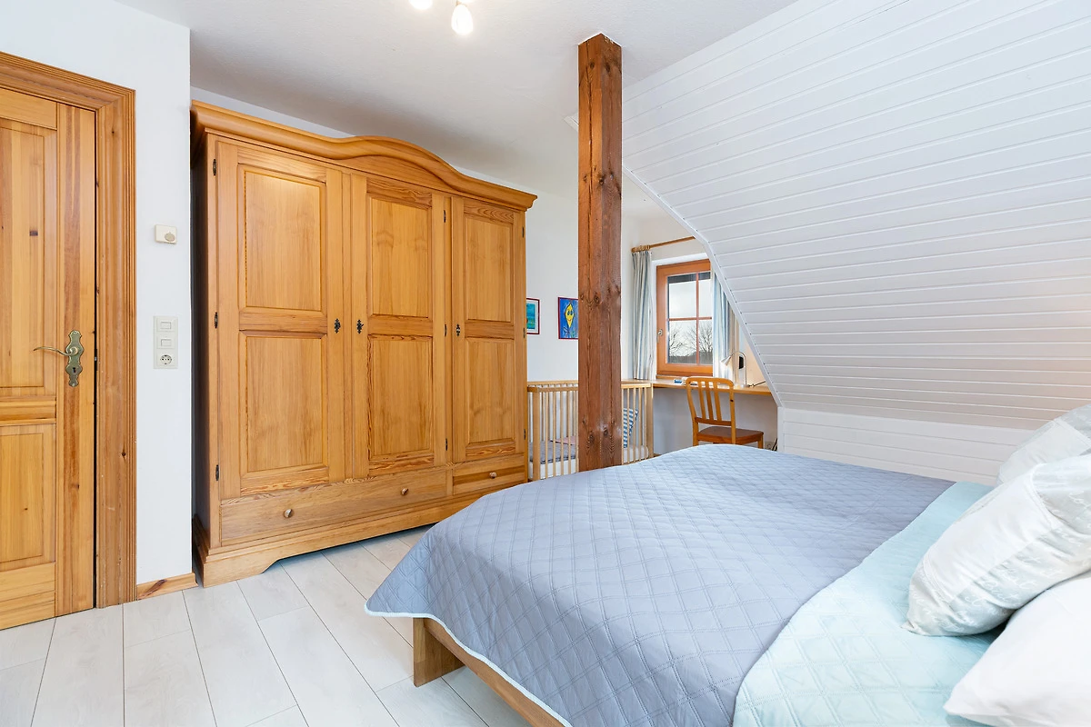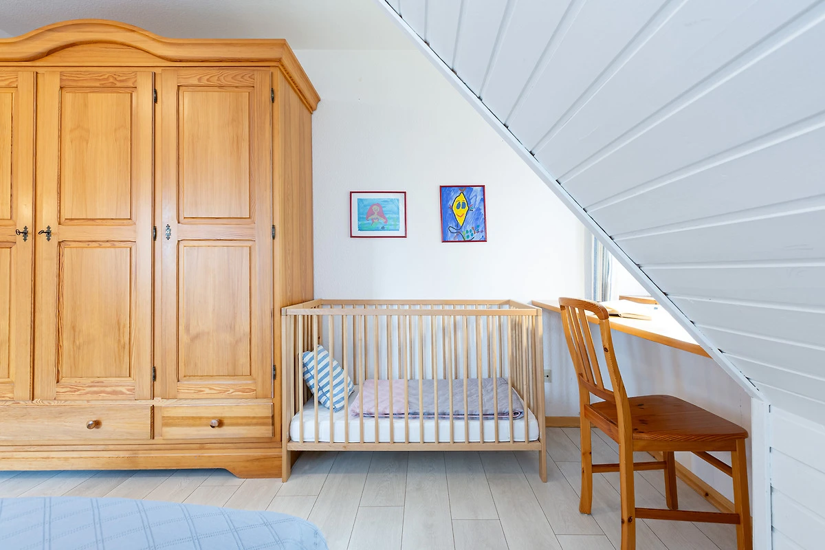 Im 1. Stock befinden sich drei Schlafräume: 1 grosser Schlafraum mit einem Doppelbett (190x200 cm), Baby-/Kleinkindbett, Schrank und Kommode und 2 Schlafräume mit jeweils 2 Einzelbetten (je 90x200 cm) und genügend Schrank- und Stauraum. Auf dieser Ebene gibt es zwei Bäder: Ein grosszügiges Badezimmer mit Dusche, Badewanne und 2 Waschtischen sowie ein weiteres Bad mit Dusche. Im Dachgeschoss finden Sie ein grosszügiges Spielparadies, das kleine und grosse Kinder herzlich willkommen heisst. Ein Doppelbett (190x200 cm), eine Spiel- und Schlafkoje stehen hier zur Verfügung sowie ein Fernseher, Blue-Ray-Player, Bücher und Spielmaterialien.