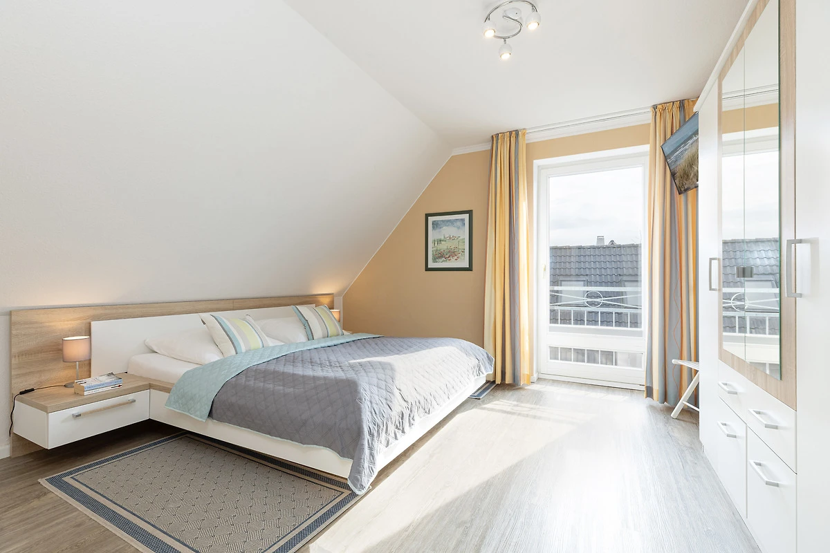 Schlafzimmer 1: 1 Doppelbett (2x 90x200 cm), Kleiderschrank, TV, Verdunkelung: Plissees