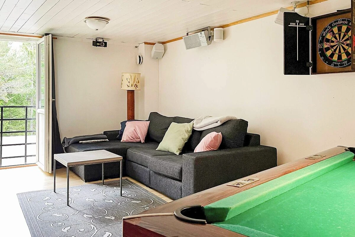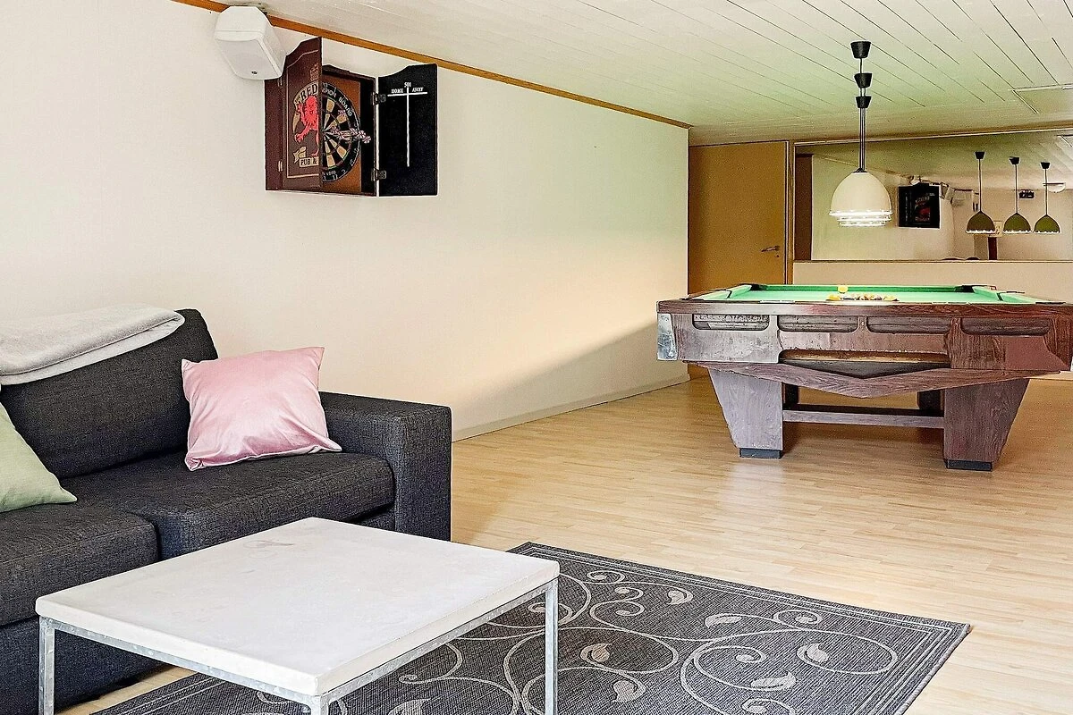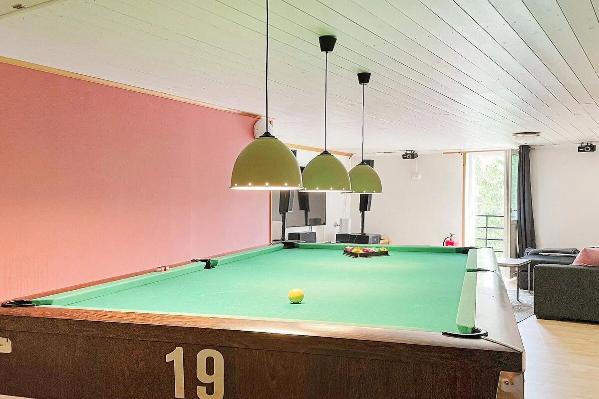 , Wohnzimmer(TV, Spielkonsole, Stereoanlage, Dart, Billard), Aufenthaltsraum(2x Einzelbett, 2x Doppelbett), Küche(Kochherd(elektrisch), Kaffeemaschine, Mikrowelle, Spülmaschine, Kühlschrank, Tiefkühlschrank(> 250L), Waschmaschine), Wohn-/Schlafzimmer(TV), Schlafzimmer(Doppelbett), Schlafzimmer(Doppelbett), Schlafzimmer(Einzelbett, 2x Etagenbett), Badezimmer(Waschbecken, Dusche, Toilette), Badezimmer(Waschbecken, Toilette), Whirlwanne(im Garten, erwärmt, 8 Personen), Sauna(im Garten, 10 Personen), Heizung(elektrisch), Garten, Hochstuhl, Luft-Luft-Wärmepumpe