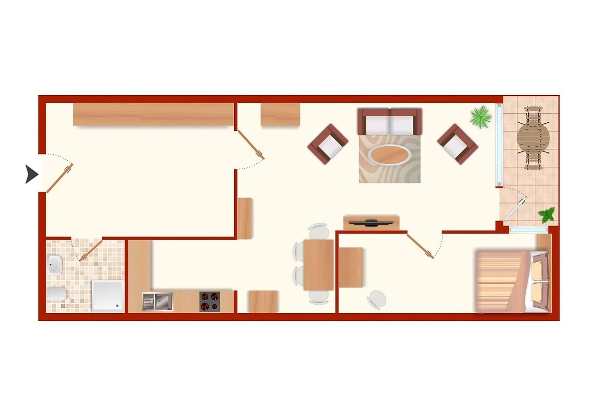 Das Appartement ist aufgeteilt in einen kombinierten Wohn- Essbereich, ein Schlafzimmer, eine separate Küche und ein Duschbad. Das Schlafzimmer verfügt über ein Doppelbett (160x200 cm). Im Wohnzimmer befindet sich ein gemütliches Sofa. Ein CD-Player mit USB-Anschluss und ein grosser Flachbildfernseher sorgen am Abend für gemütliche Stunden. Die Küche ist mit allen nötigen Geräten ausgestattet. Für unsere Angler halten wir einen Gefrierschrank mit separaten Fächern im Haus bereit.