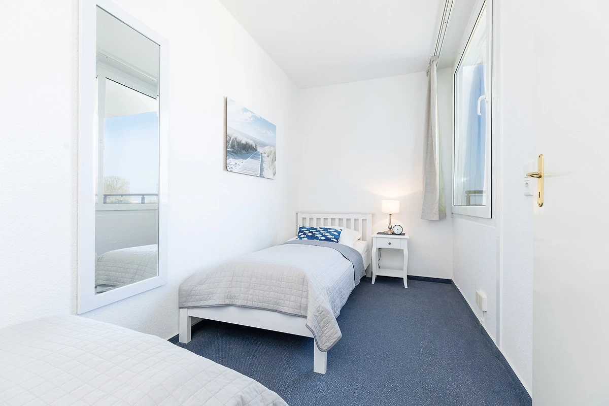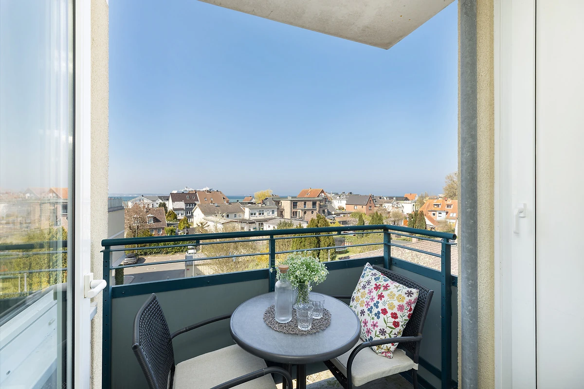 Die Wohnung teilt sich auf in eine Kochnische, ein Bad mit Dusche, einen Wohn-/Schlafraum mit Essecke und einen separaten Schlafraum mit 2 Einzelbetten. Vom Balkon aus können Sie zwischen den Häusern immer wieder einen Blick auf die Kieler Förde erhaschen.
