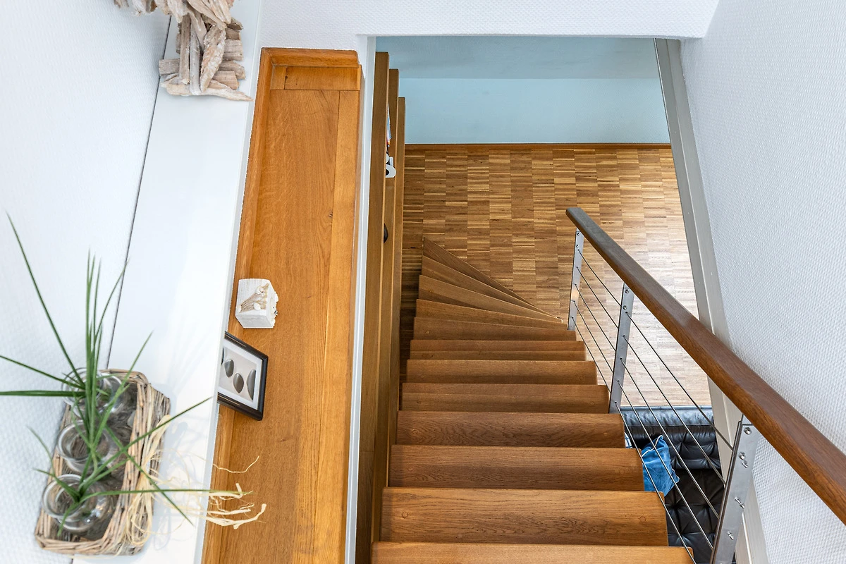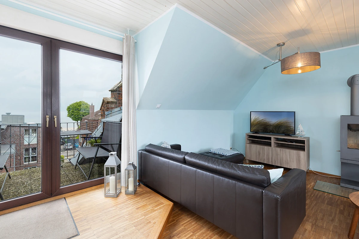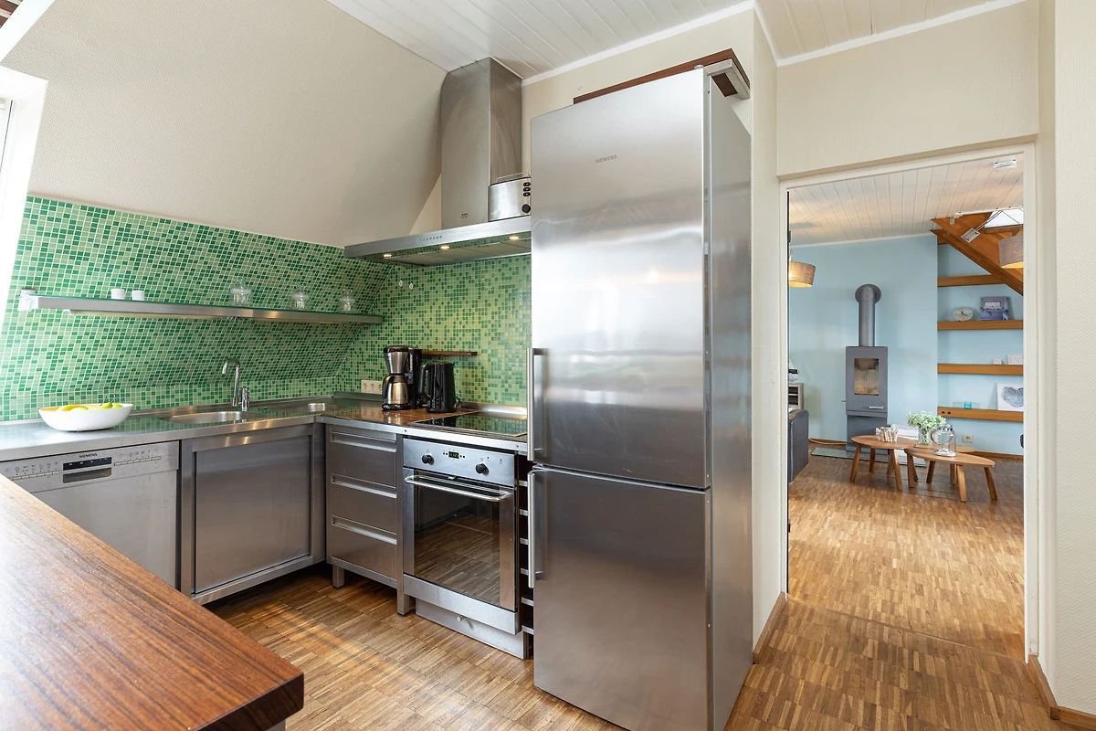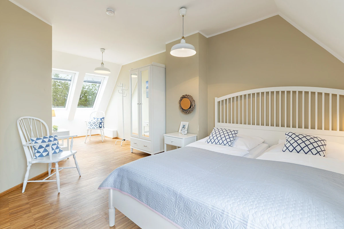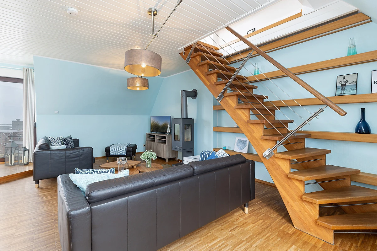 Die Wohnung ist komplett mit Holzfussboden ausgestattet. Die zwei geräumigen Bäder, eines mit einem Wannenbad, das andere mit Dusche sind frisch, hell und modern. Zum gemeinsam Kochen lädt die moderne Wohnküche ein. Ein charmanter Tresen für den "schnellen Kaffee", teilt die bestens ausgestattete Küche vom Essplatz. Ein Kinderhochstuhl für die kleinen Gäste steht bereit. Beim Frühstück mit Blick auf die Ostsee fängt der Tag schon mit Erholung an. Das geschmackvoll eingerichtete Wohnzimmer hat Zugang zum Balkon mit Lounge-Möbeln zum Ausruhen und Beobachten der vorbeiziehenden Segel- und Kreuzfahrtschiffe. Ein Fernglas liegt dafür für Sie bereit. An kühlen Abenden sorgt der Kamin für noch mehr Gemütlichkeit. Die 4 Schlafzimmer (eines davon ist ein Durchgangszimmer) im Dachgeschoss verfügen über Cabriofenster mit Austritt. Selbst aus den Doppelbetten kann man den herrlichen Ostseeblick geniessen. Das grosse Schlafzimmer in der unteren Etage (ebenfalls mit Doppelbett ausgestattet) verfügt über einen 2. Fernseher und weiteren kleinen Balkon, auch hier hat man den herrlichen Panoramablick über die Ostsee.