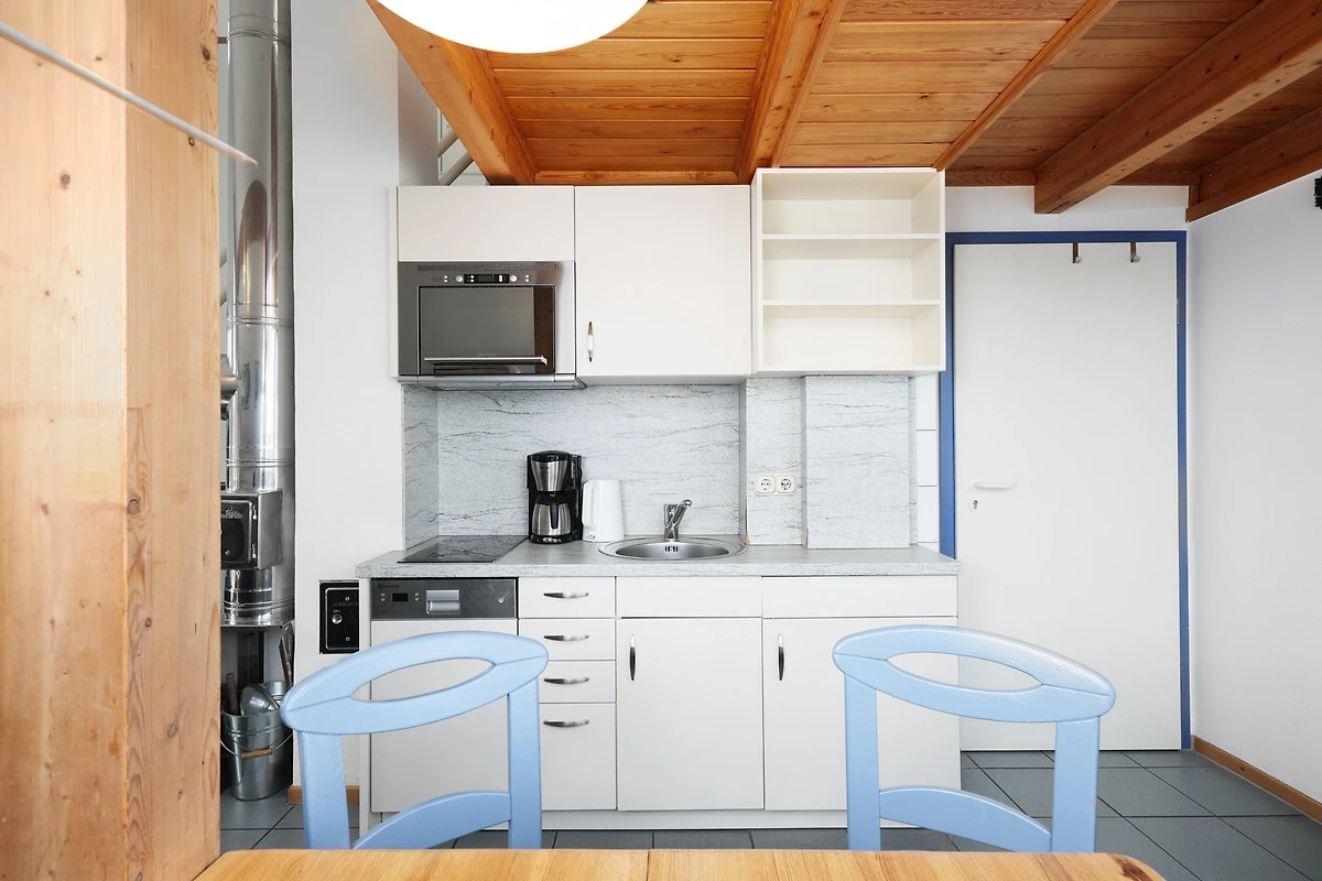 Der Ausblick vom 2. Stock aus ist atemberaubend. Das Appartement ist geschmackvoll und mit viel Liebe zum Detail eingerichtet. Der Kaminofen und das moderne Medienequipment laden zu gemütlichen Abenden ein, wenn das Wetter einmal nicht so schön ist. Sie wohnen hier in einem Galerieappartement: Auf der Galerie finden Sie das bequeme Doppelbett und ein zweiter Fernseher. Im unteren Bereich befindet sich der gemütliche Wohnraum mit dem Kaminofen, die umfangreich ausgestattete Küchenzeile. Das Tageslichtbad ist hell und freundlich eingerichtet.