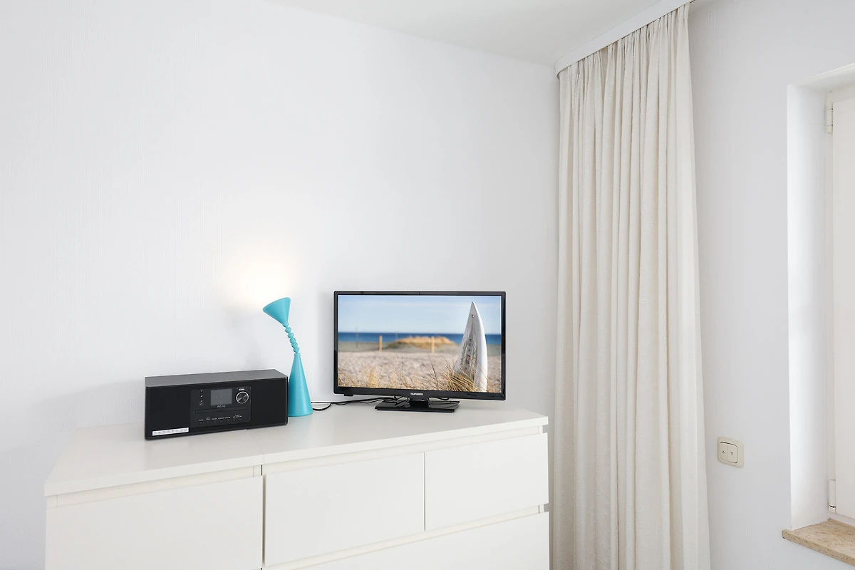 Schlafzimmer 2: 2 Einzelbetten (90x200 cm), Kommode, TV, Verdunkelung: elektrische Rollläden