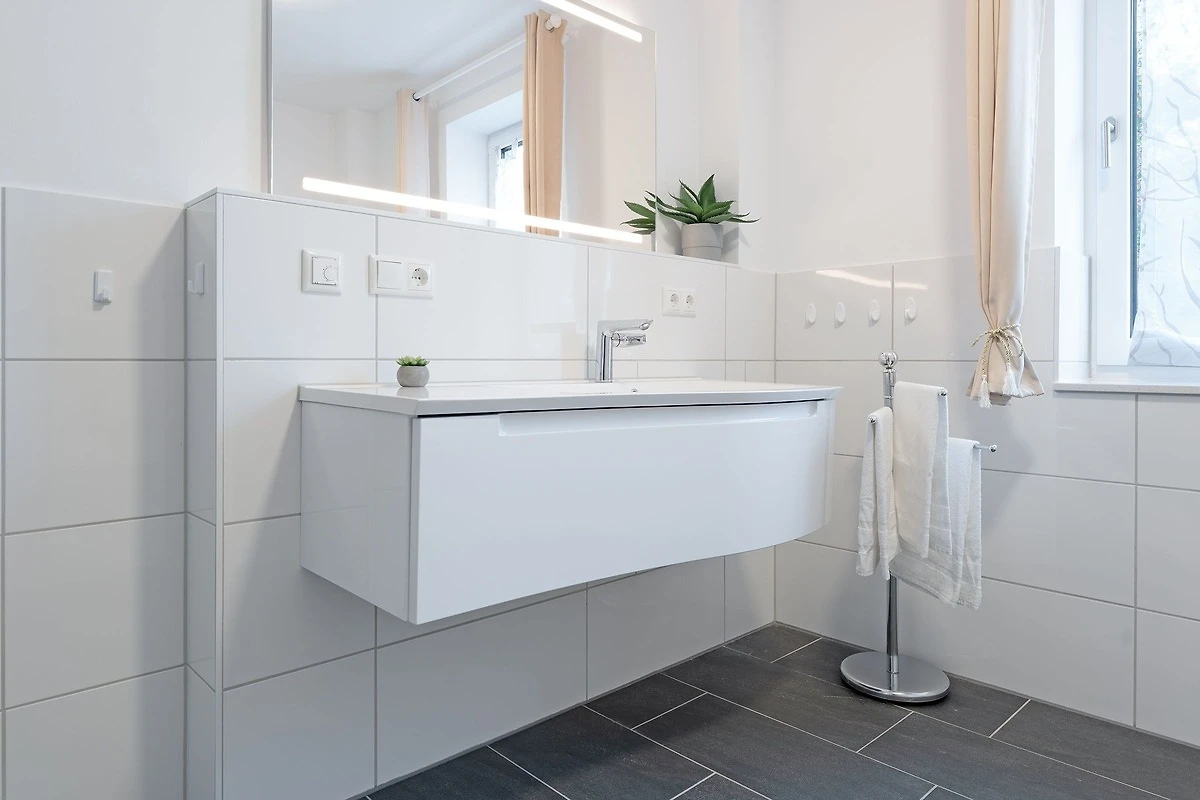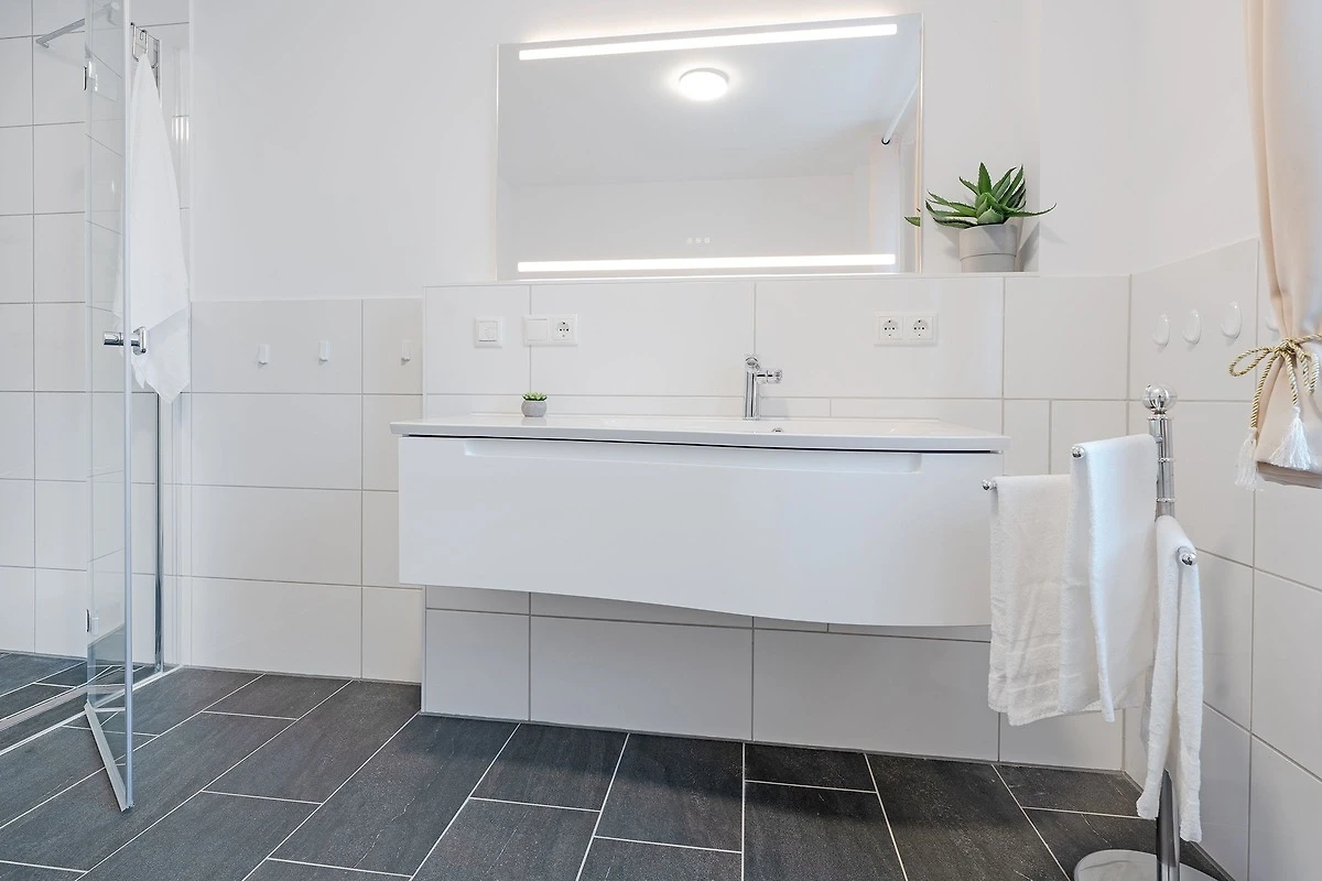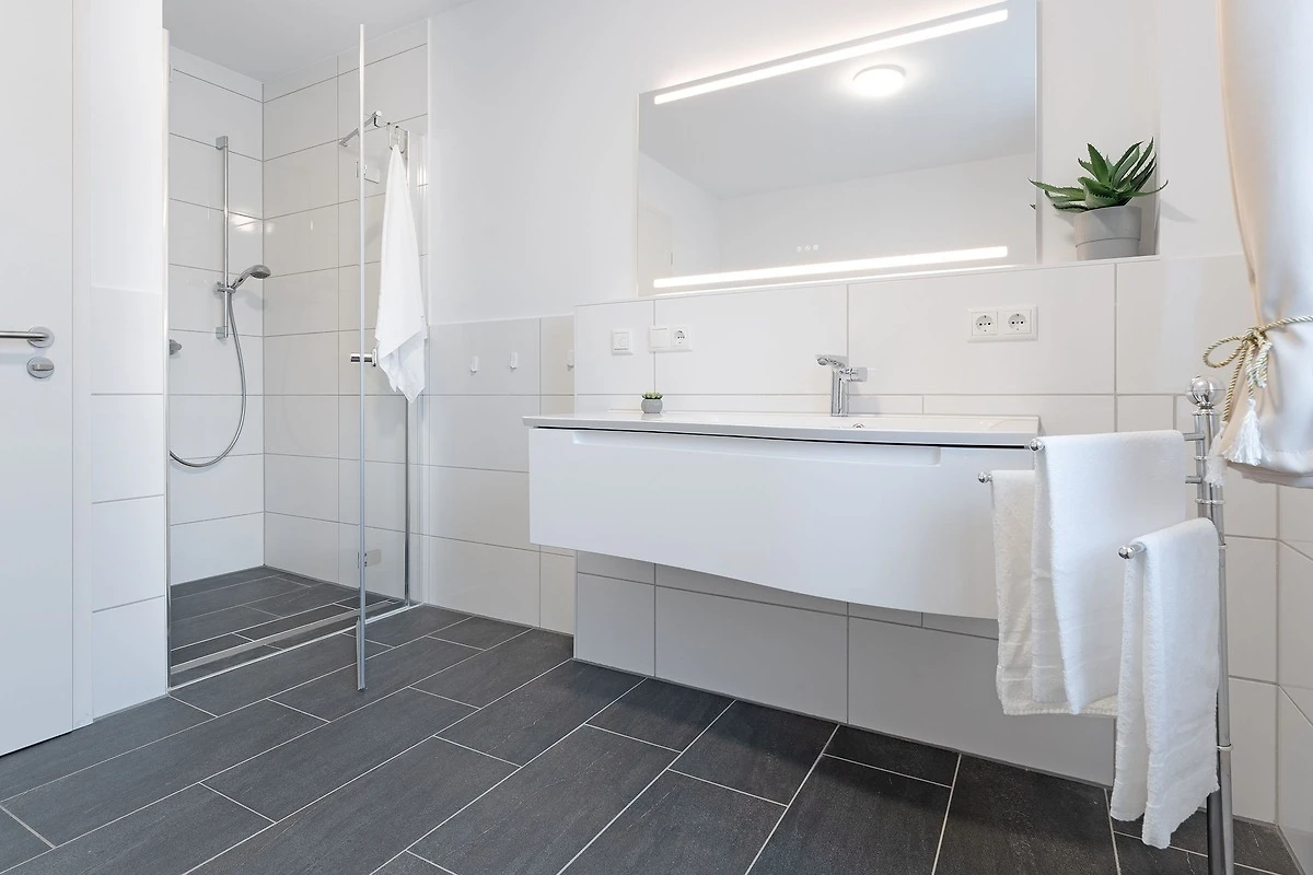 Das Badezimmer ist modern und mit einer bodengleichen Dusche, Fussbodenheizung und einem Haartrockner ausgestattet. Zusätzlich gibt es ein Gäste-WC.