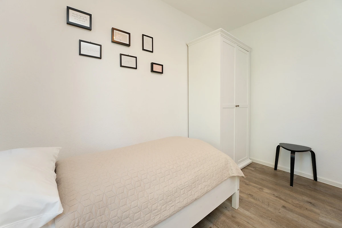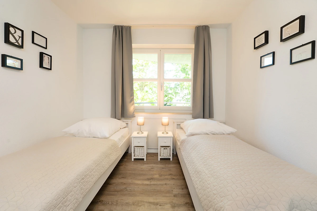 Schlafzimmer 2: 2 Einzelbetten (je 90x200 cm), Kleiderschrank, Verdunkelung: Gardinen