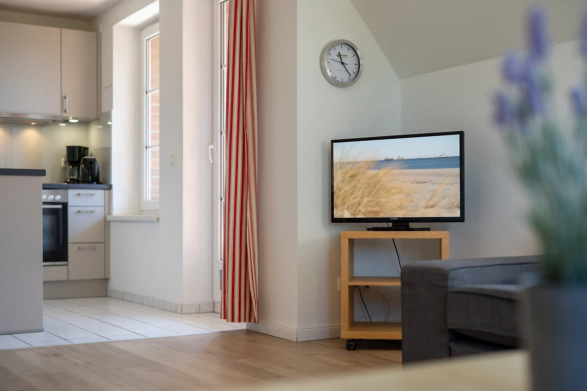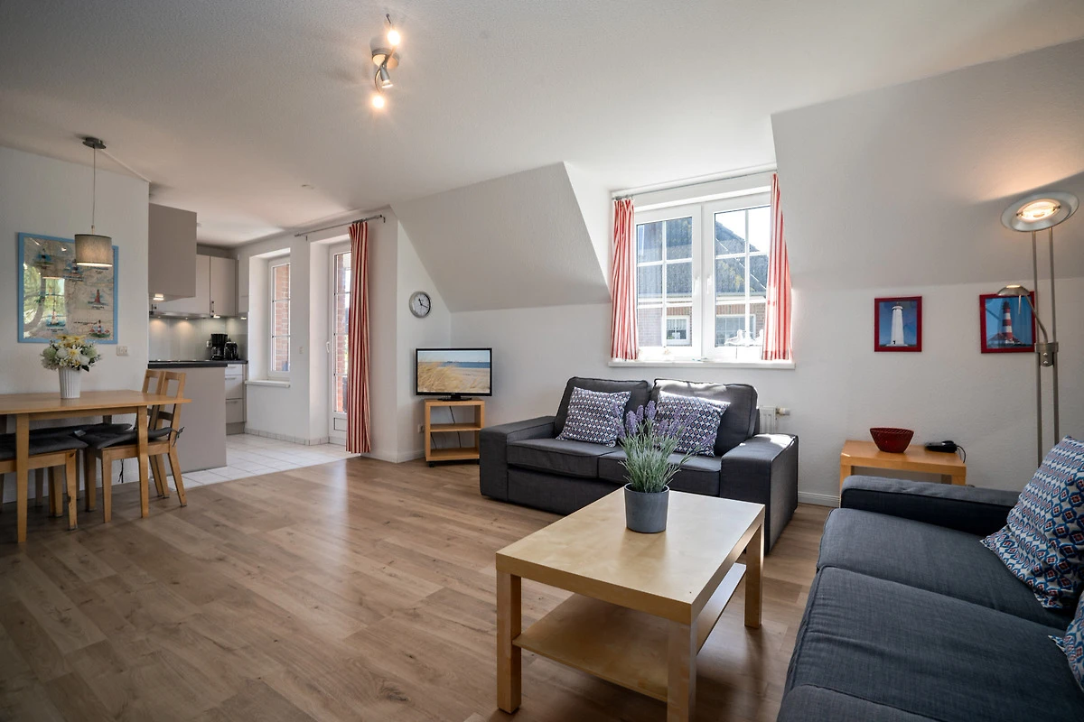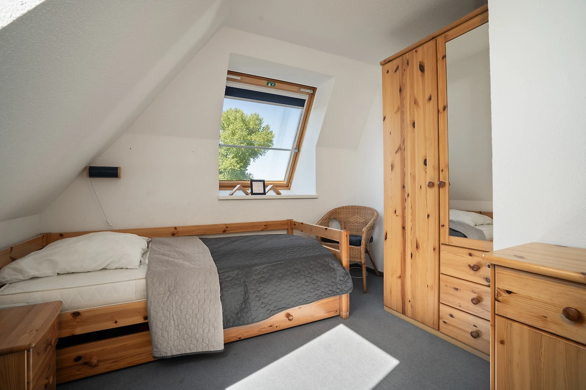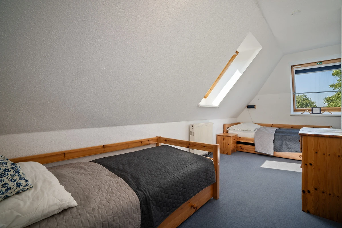Auf einer Wohnfläche von ca. 65 m² verteilen sich ein Wohnzimmer mit intergrierter Küchenzeile und Essbereich, ein Duschbad und zwei separate Schlafzimmer im Dachgeschoss, die mit einem Doppelbett (2x 90x200 cm) und zwei Einzelbetten (je 90x200 cm) ausgestattet sind.