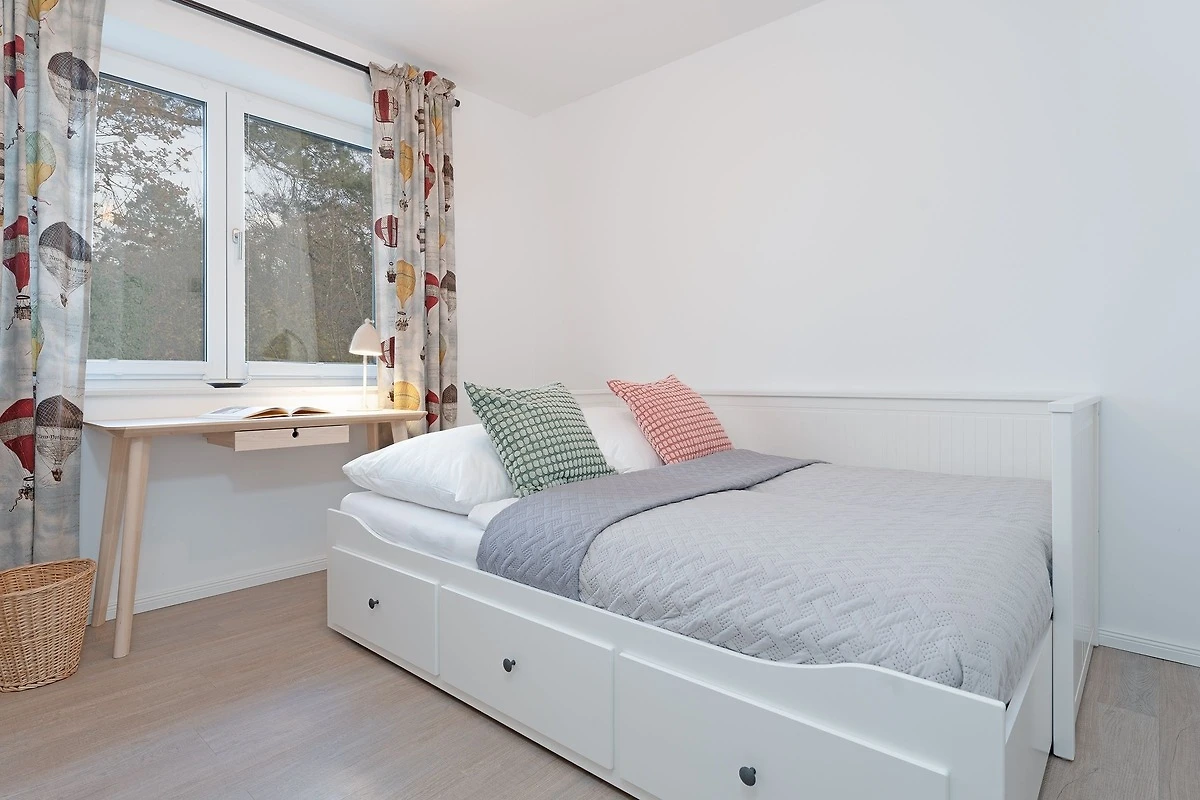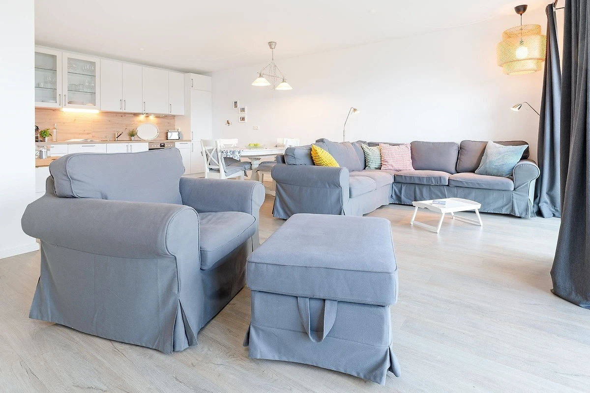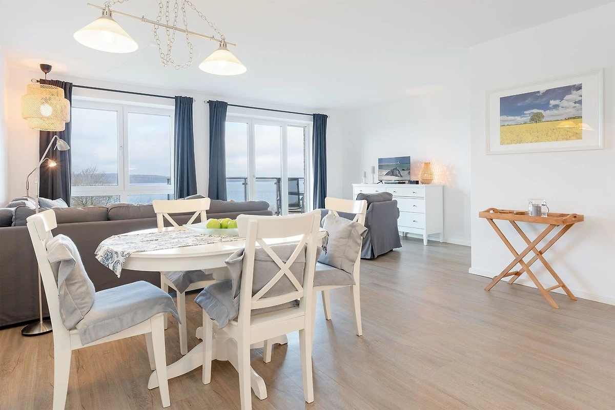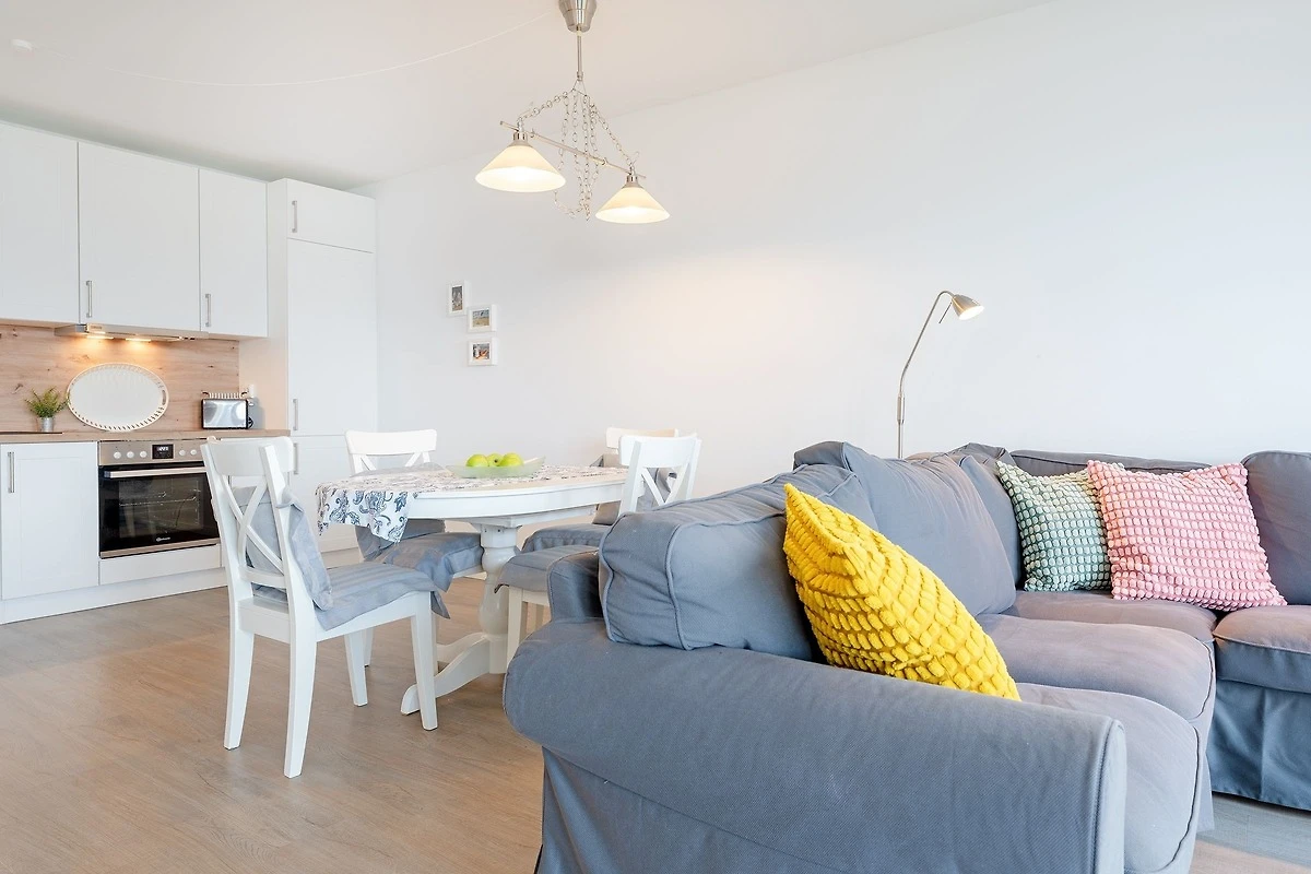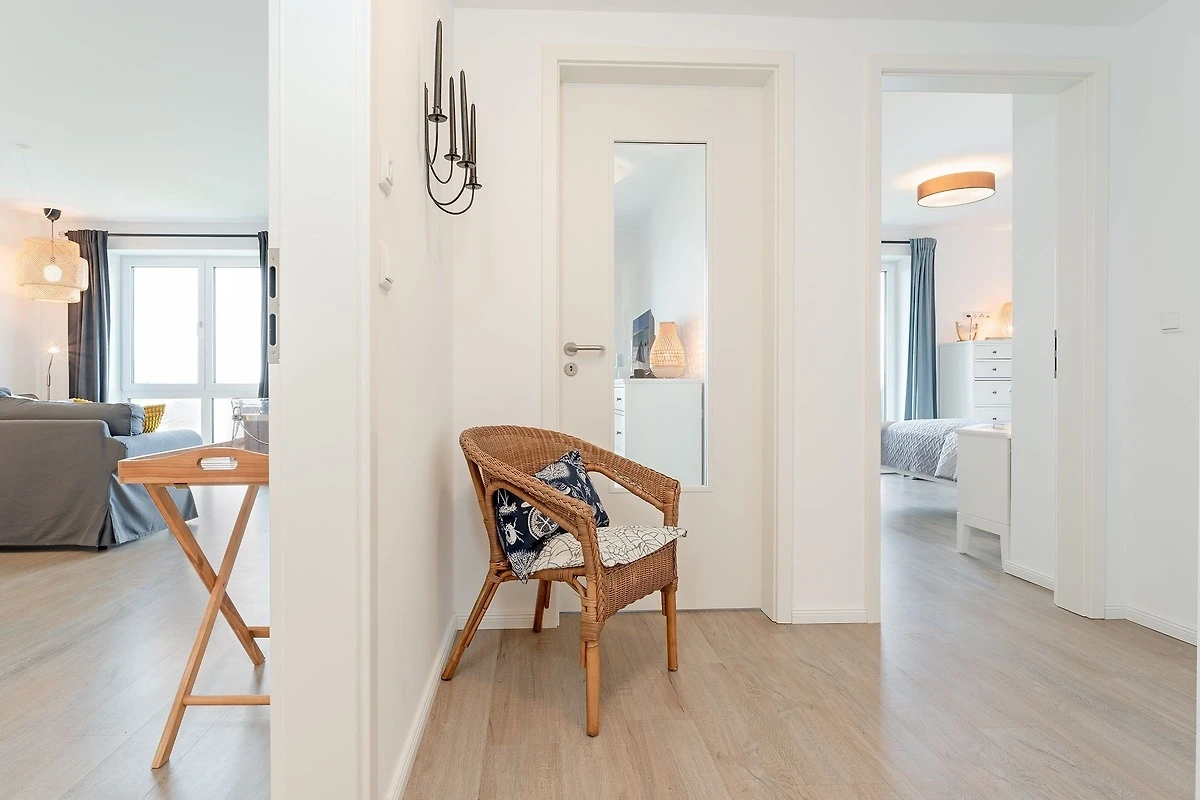 Der helle Wohnbereich empfängt Sie mit einer gemütlichen Sitzecke und einer kuscheligen Sofalandschaft – und einem traumhaften Blick auf den Grossen Plöner See. Treten Sie auf den grosszügigen, möblierten Südwest-Balkon und lassen Sie hier den Abend mit Ihren Lieblingsspeisen ausklingen. Die zum Wohnbereich hin offene, moderne Küche mit Geschirrspüler und Nespresso-Maschine bringt Hobbyköche sicher zum Lächeln. Nach einem tollen Urlaubstag finden Sie im Doppelbett (2x 90x200 cm) im Schlafzimmer erholsamen Schlaf. Von hier aus haben Sie auch Zutritt auf den grossen Balkon. Das zweite Schlafzimmer bietet ein Kojenbett (80x200 cm, ausziehbar auf 160x200 cm). Morgens begrüsst Sie das tageslichthelle Bad mit bodengleicher Dusche und Badewanne. Dazu gibt es ein Gäste-WC. Ziehen Sie zum Start in den Tag ein paar Bahnen durch den See, eine schöne Badestelle ist fussläufig erreichbar.