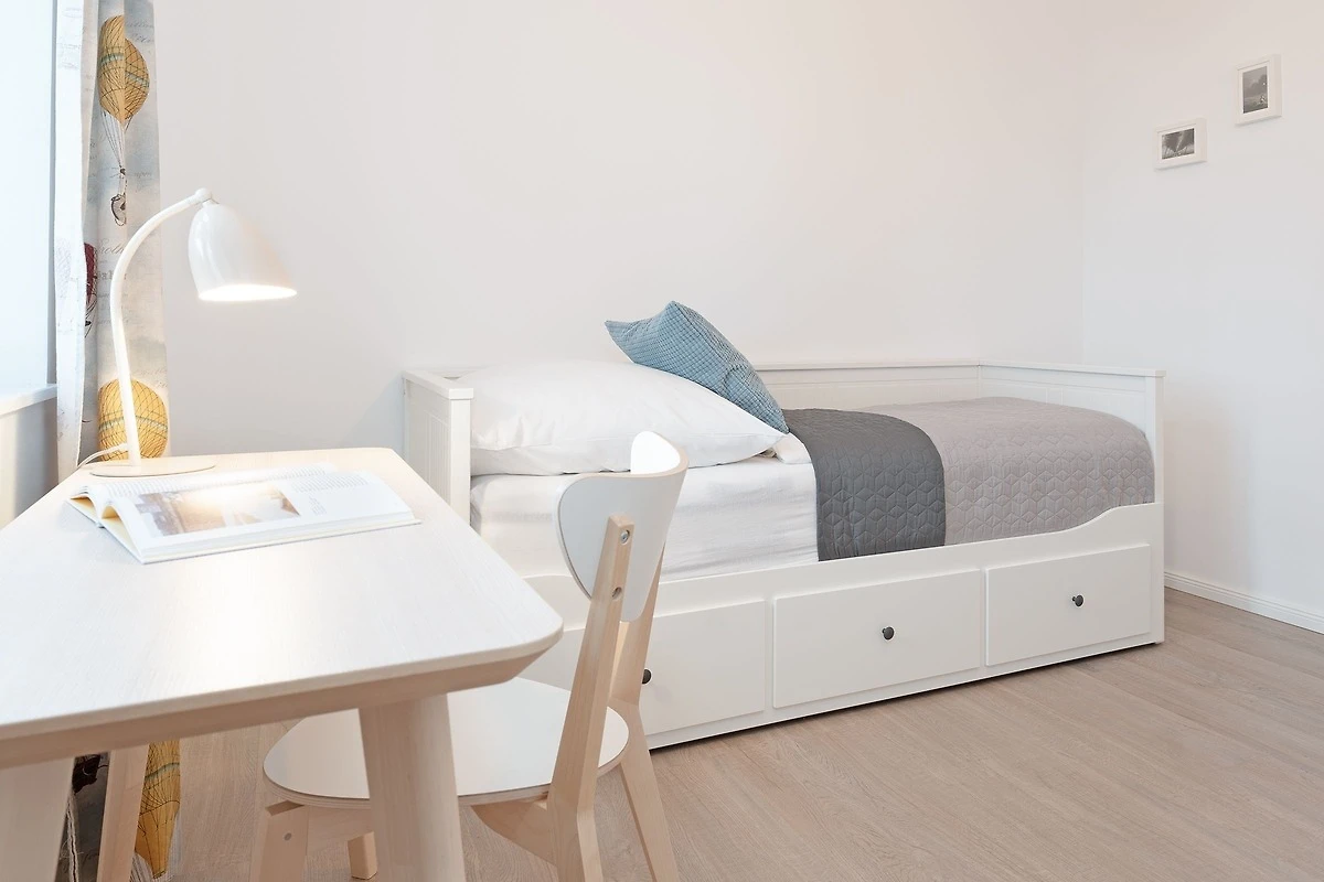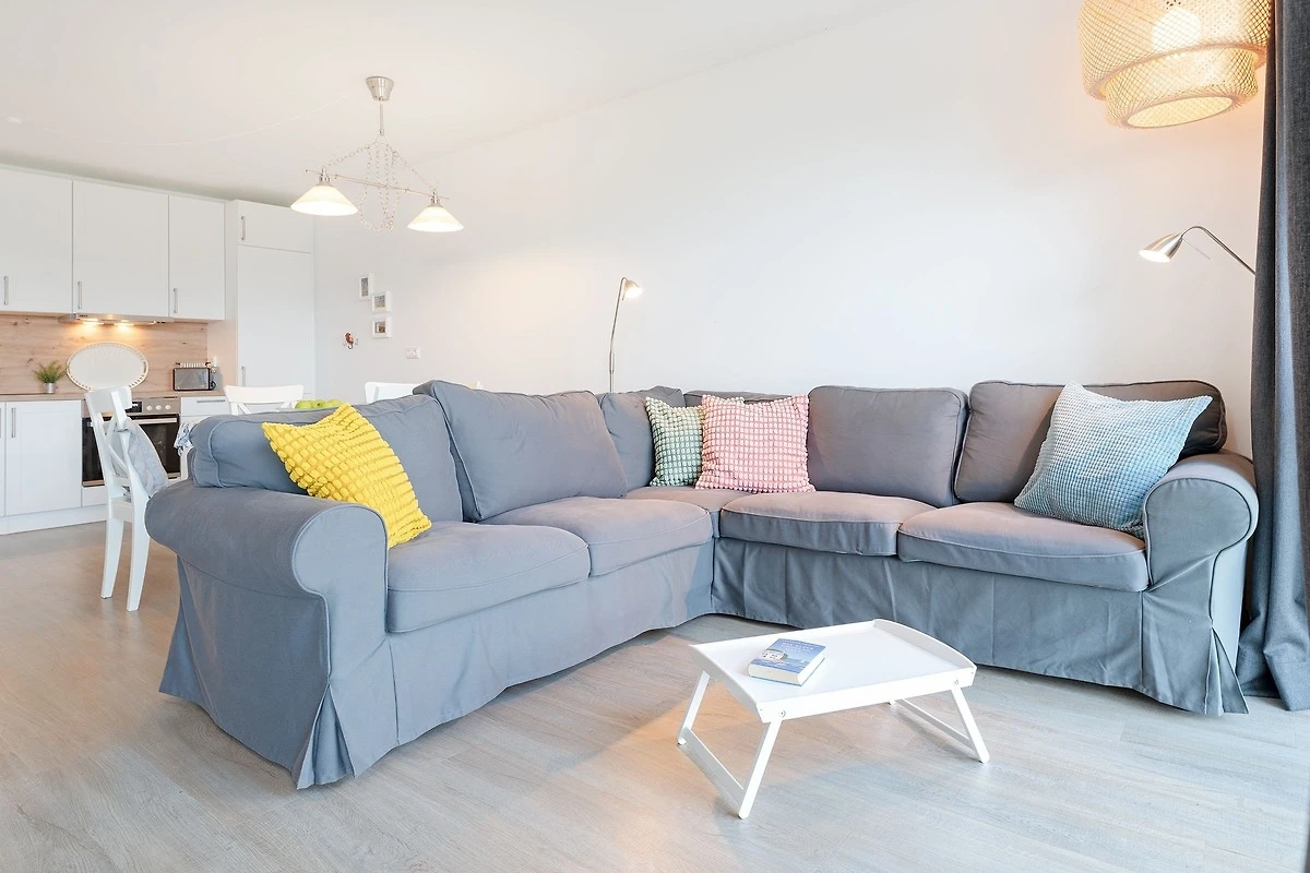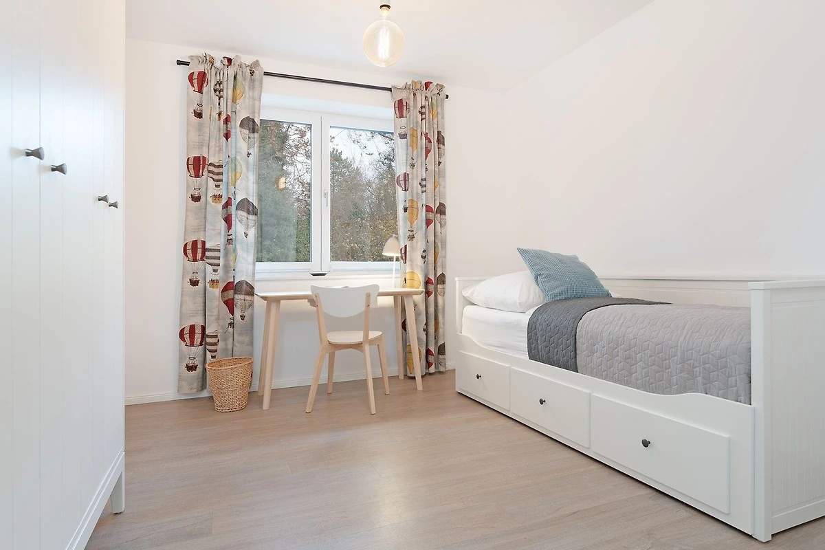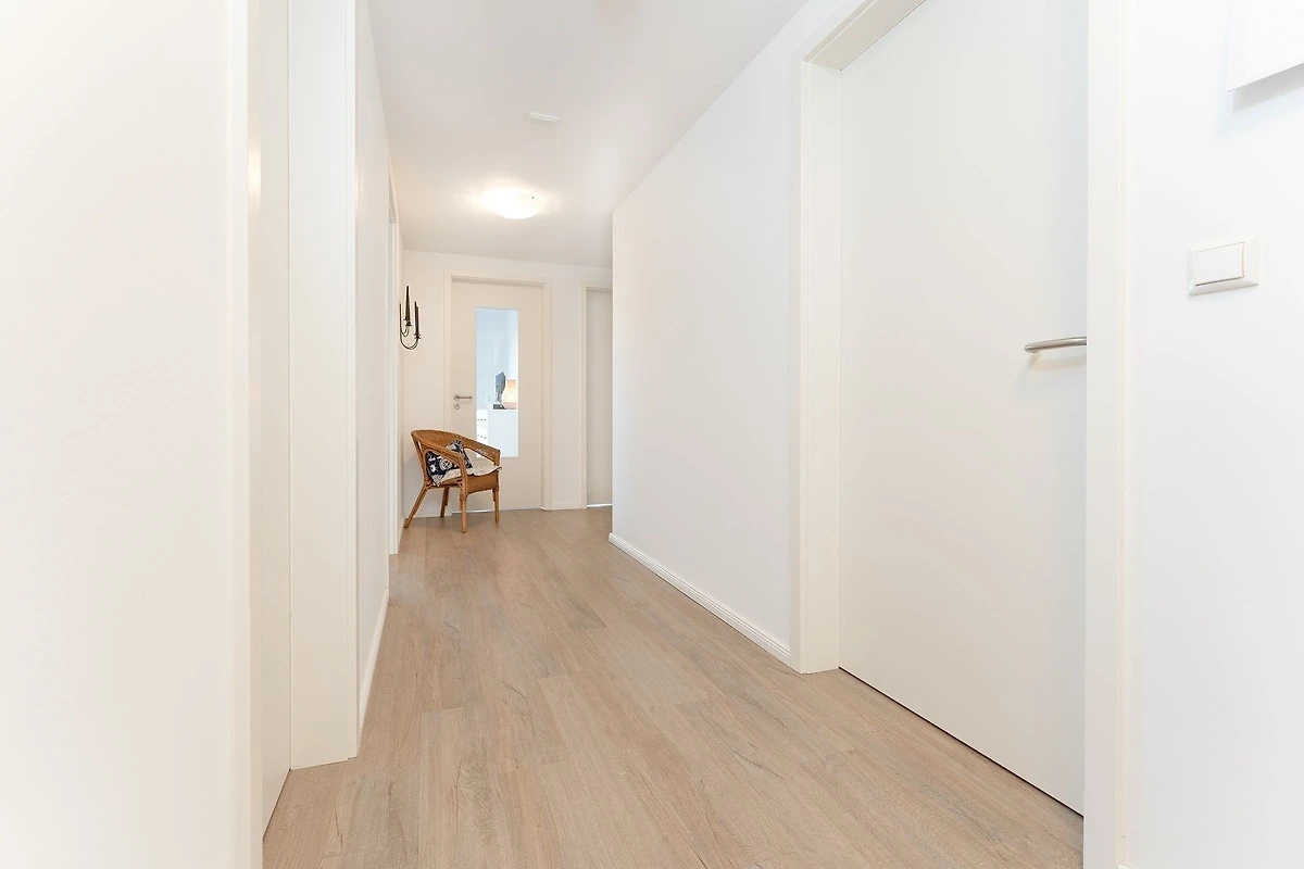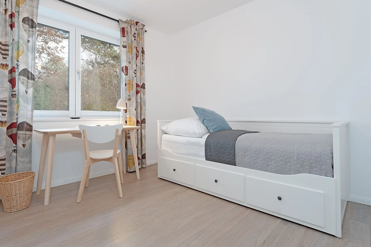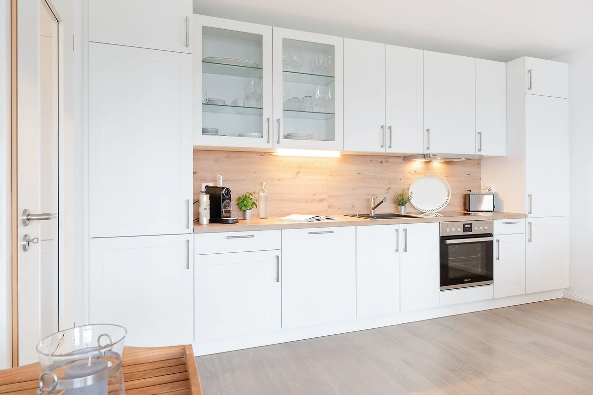 Der helle Wohnbereich empfängt Sie mit einer gemütlichen Sitzecke und einer kuscheligen Sofalandschaft – und einem traumhaften Blick auf den Grossen Plöner See. Treten Sie auf den grosszügigen, möblierten Südwest-Balkon und lassen Sie hier den Abend mit Ihren Lieblingsspeisen ausklingen. Die zum Wohnbereich hin offene, moderne Küche mit Geschirrspüler und Nespresso-Maschine bringt Hobbyköche sicher zum Lächeln. Nach einem tollen Urlaubstag finden Sie im Doppelbett (2x 90x200 cm) im Schlafzimmer erholsamen Schlaf. Von hier aus haben Sie auch Zutritt auf den grossen Balkon. Das zweite Schlafzimmer bietet ein Kojenbett (80x200 cm, ausziehbar auf 160x200 cm). Morgens begrüsst Sie das tageslichthelle Bad mit bodengleicher Dusche und Badewanne. Dazu gibt es ein Gäste-WC. Ziehen Sie zum Start in den Tag ein paar Bahnen durch den See, eine schöne Badestelle ist fussläufig erreichbar.