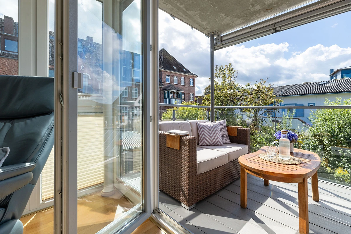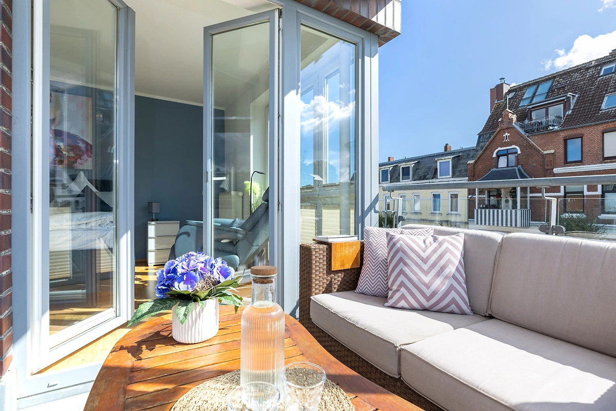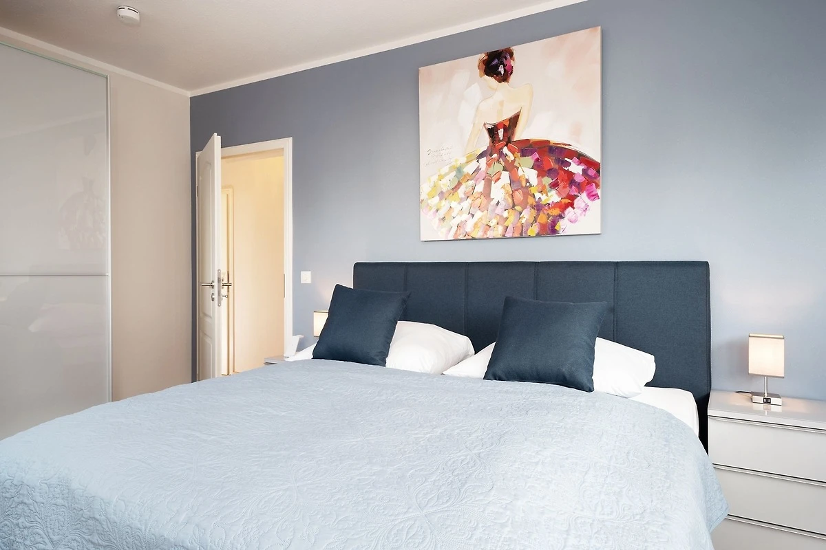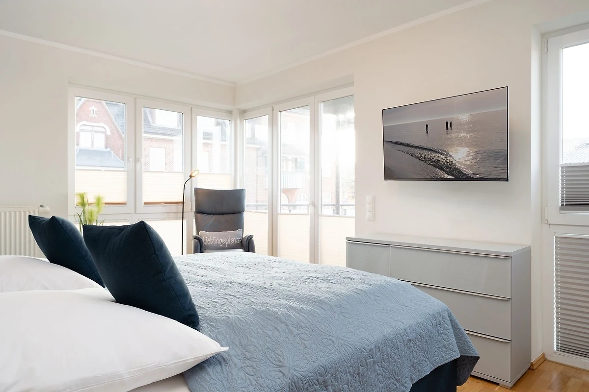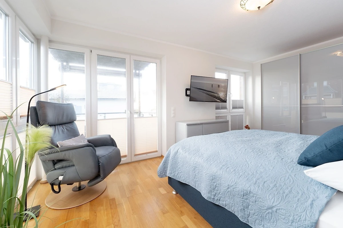 Erleben Sie unvergessliche Urlaubstage in dieser modernen Ferienwohnung – geniessen Sie den schönen Blick auf die Kieler Förde und beobachten Sie Kreuzfahrtschiffe wie AIDA, Mein Schiff oder sogar die Queen Mary 2, die direkt vor Laboe vorbeiziehen. Lauschen Sie dem Meeresrauschen und lassen Sie die spektakulären Sonnenuntergänge von einem der drei Balkone auf sich wirken. Für gemütliche Stunden stehen Ihnen zwei elektrisch verstellbare Relax-Sessel im Wohnbereich zur Verfügung. In den warmen Sommermonaten sorgt eine moderne Klimaanlage für ein angenehme Temperaturen. Die Schlafcouch im Wohnzimmer (ca. 160x190 cm, mit Lattenrost) lässt sich mit einem Handgriff in ein vollwertiges Bett für zwei Personen verwandeln.