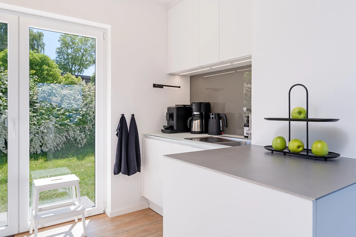 Die offene Küche ist bestens ausgestattet mit einem Ceranherd, Backofen, Kühlschrank mit Gefrierfach, Spülmaschine, Kaffeemaschine und Toaster. Der Essbereich bietet ausreichend Platz für gemeinsame Mahlzeiten.