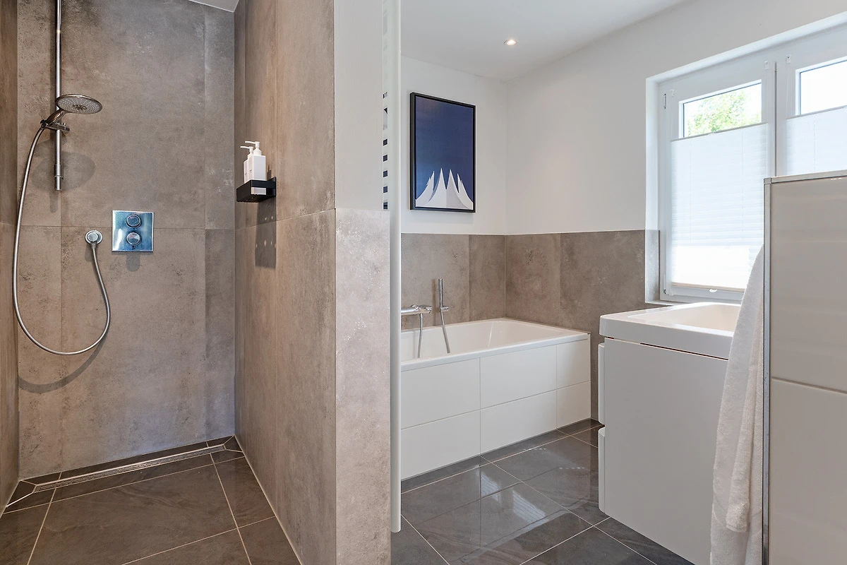 Zwei moderne Badezimmer verfügen über bodengleiche Duschen, eine Badewanne, Waschbecken und WC. Zusätzlich stehen ein Haartrockner sowie eine Waschmaschine und ein Trockner zur Verfügung. Eine Sauna zur Eigennutzung verspricht erholsame Stunden.