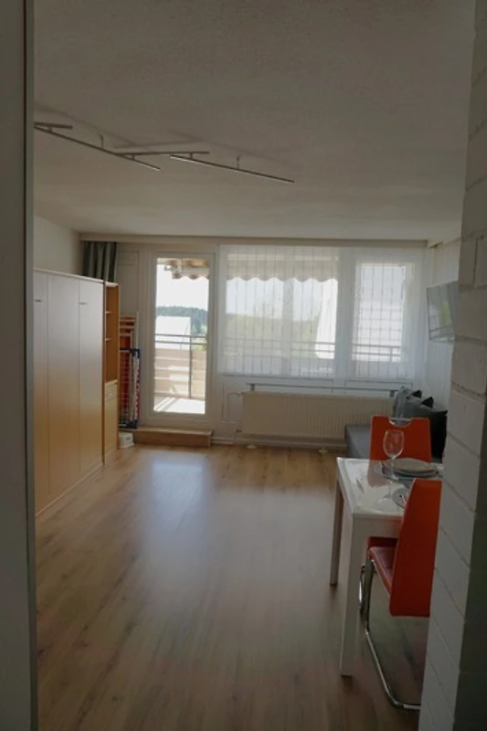 Das Apartment verfügt über eine grosszügige Garderobe, einen Kleiderschrank mit Möglichkeit zur Kofferablage, dem zweckmässig eingerichteten Bad mit Waschbecken, WC, Dusche und ausreichend Ablagemöglichkeiten, einem geräumige Wohn-/Schlafzimmer mit Schrankbett und ausziehbarer Doppelcouch und einer gut ausgestatteten Küche mit Geschirrspüler, Kühlschrank mit Gefrierfach, zwei Induktionskochfelder, Lüfter, Mikrowelle mit Grillfunktion, Kaffeemaschine, Toaster, Wasserkocher, Eierkocher, Mülltrennsystem, Spüle und sämtlicher Ausstattung.