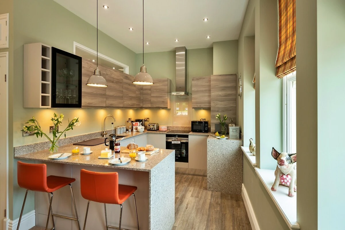 Das Apartment One befindet sich im ersten Stock und ist geschmackvoll eingerichtet, um einen komfortablen und erholsamen Aufenthalt zu gewährleisten. Der geräumige, offene Wohnbereich umfasst einen Essbereich zwischen der Küche und dem Wohnzimmer. Zu den Unterhaltungsmöglichkeiten gehören ein 43-Zoll-Freeview-Smart-TV, ein DVD-Player, ein CD-Player und kostenloses WLAN, die für ausreichend Unterhaltung sorgen. In der voll ausgestatteten Küche können Sie köstliche Mahlzeiten oder ein besonderes Bankett zubereiten, wobei für Ihren Komfort eine Auswahl an Tee, Kaffee und Milch bereitgestellt wird Für zusätzlichen Komfort befindet sich im Flur eine zusätzliche separate Toilette.