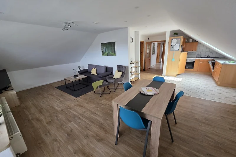 - Wohnbereich: Grosszügiger Wohnraum mit gemütlicher Couch, Fernseher und Essbereich