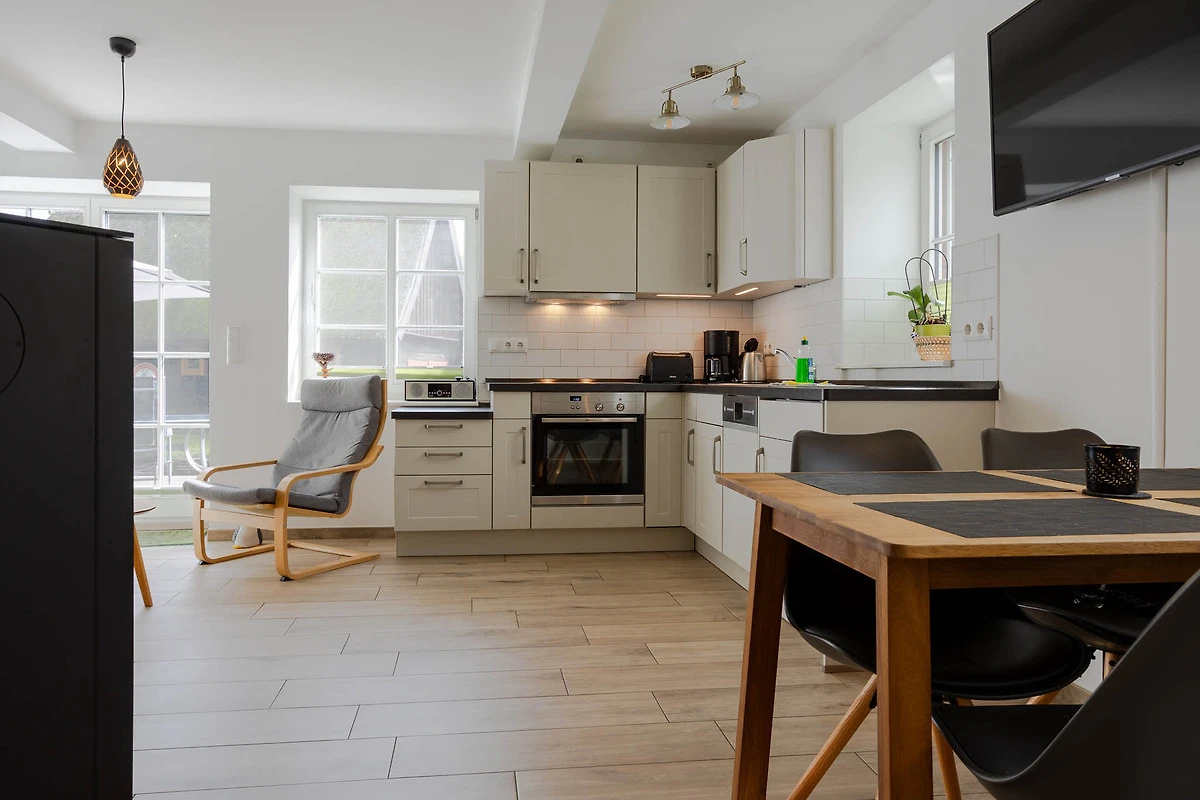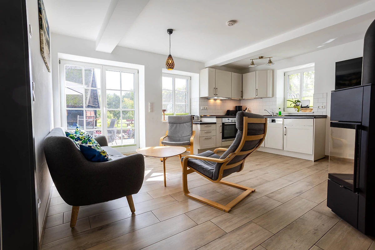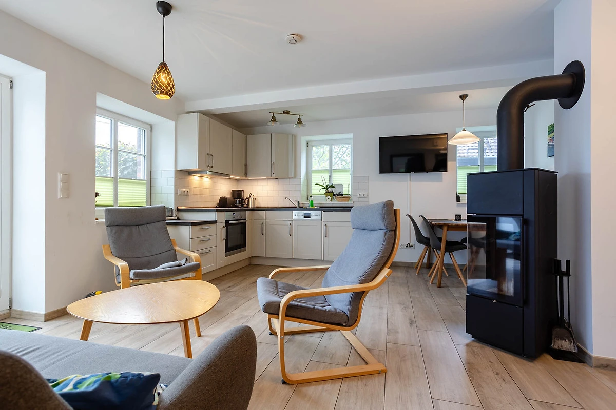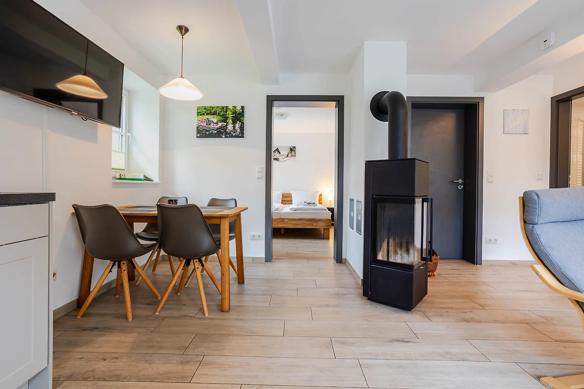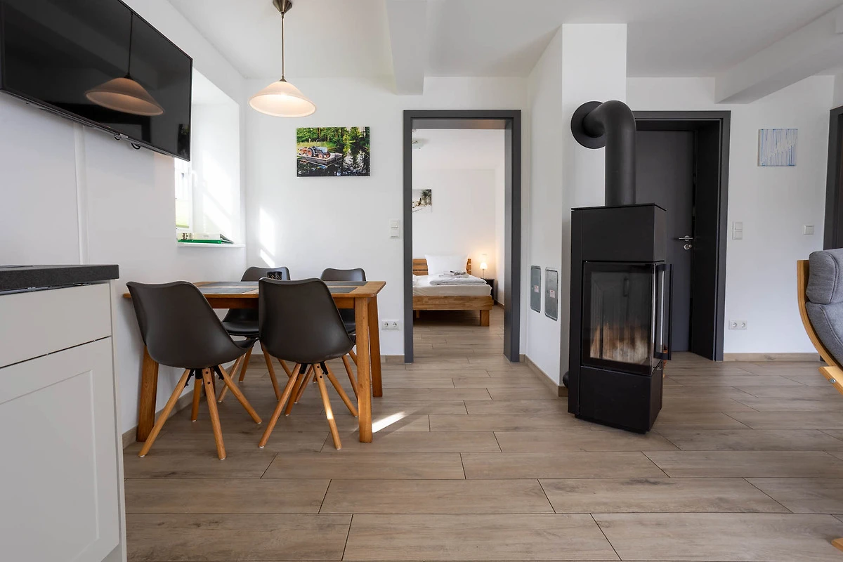 Der Name dieser Ferienwohnung für 4 Personen ist Programm. Bis zum Jahr 2003 standen in dieser Ferienunterkunft noch Rinder. Und dort, wo Sie heute Ihr Frühstück geniessen, wurden Kälber aufgezogen. Ein absolutes Alleinstellungsmerkmal dieser Ferienwohnung am Wasser ist mit Sicherheit die sonnige Terrasse direkt am Dolzkefliess, die vom Wohnzimmer aus betreten werden kann. Zwei getrennte Schlafzimmer sorgen für Rückzugsräume und ein grosses Duschbad für ein gewisses Wellnessfeeling. Alle Räume dieser grosszügigen 3-Zimmer-Ferienwohnung werden über den Fussboden geheizt. Für einen Schuss Behaglichkeit sorgt ein Kamin und alle Fenster sowie die Terrassentür sind durch Insektengitter geschützt. Natürlich haben Sie auch Zugriff auf das Gäste-WLAN. Ein Stellplatz für Ihren PKW finden Sie direkt an der Ferienwohnung. Eine 11 kW Wallbox ist ebenfalls vorhanden und zusätzliche Parkplätze können in fussläufiger Entfernung angemietet werden.