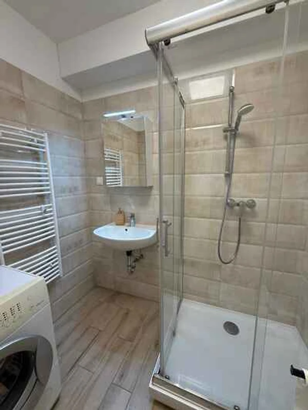 und führt über eine Innentreppe direkt in den Vorraum. Wohn/Schlafzimmer mit 2 Zusatzbetten auf Doppelausziehcouch. Schlafzimmer mit 1 Doppelbett. Kochecke im Wohn/Schlafzimmer mit Essecke (4 Plätze), Elektroherd (Cerankochfeld, 2 Platten), Backofen, Dunstabzugshaube, Kühlschrank (Eisfach), Mikrowelle, Kaffeemaschine, Toaster und elektrischem Wasserkocher. Bad mit Waschmaschine, Dusche, 1 Waschbecken, WC und Föhn.