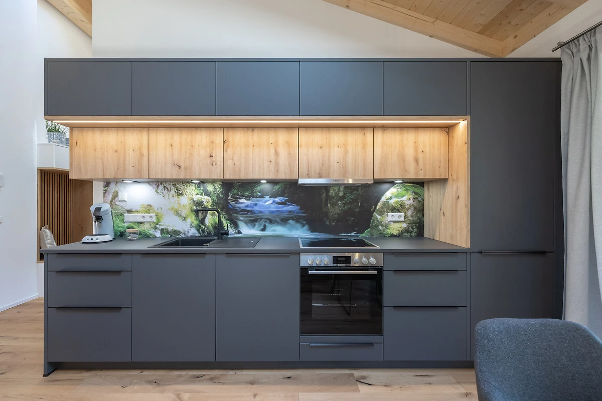- eine vollausgestattete Küche mit Kühlschrank mit Gefrierfach, Herd mit 4 Kochfeldern, Backofen, Wasserkocher, Toaster, Pad-kaffeemaschine, Spülmaschine und Küchengrundausstattung
