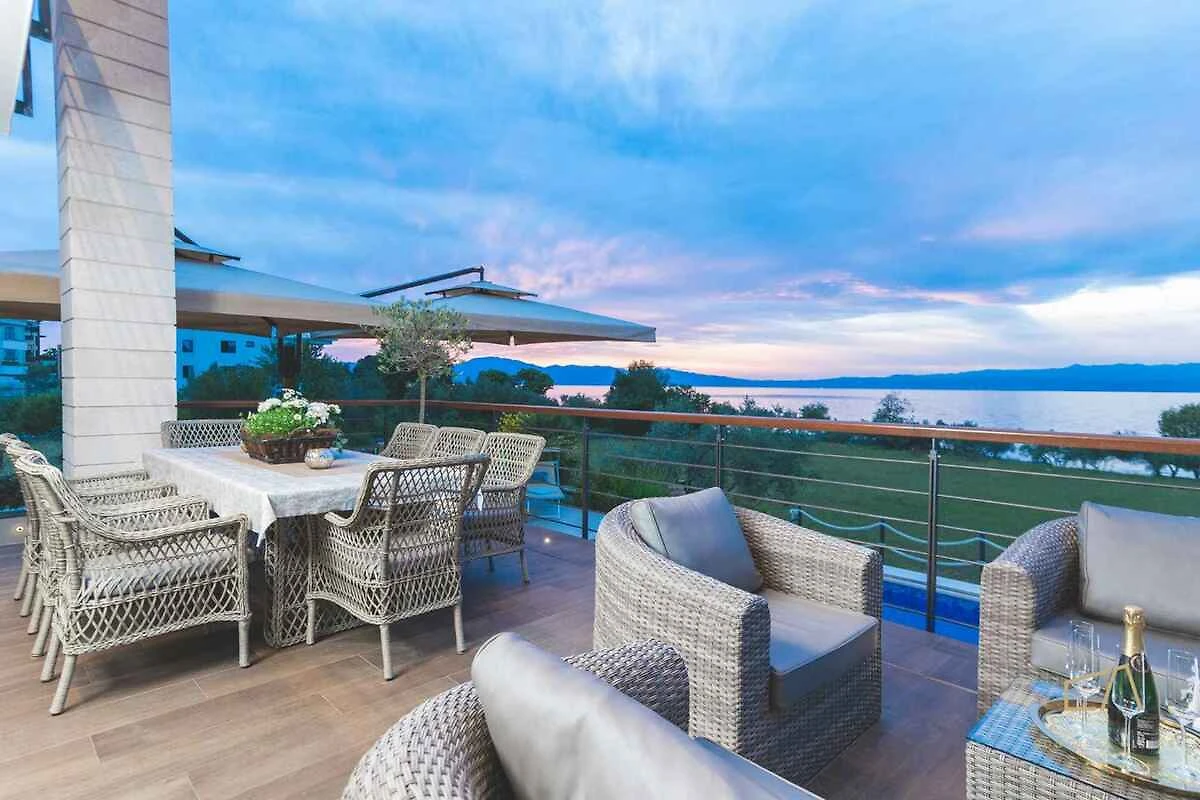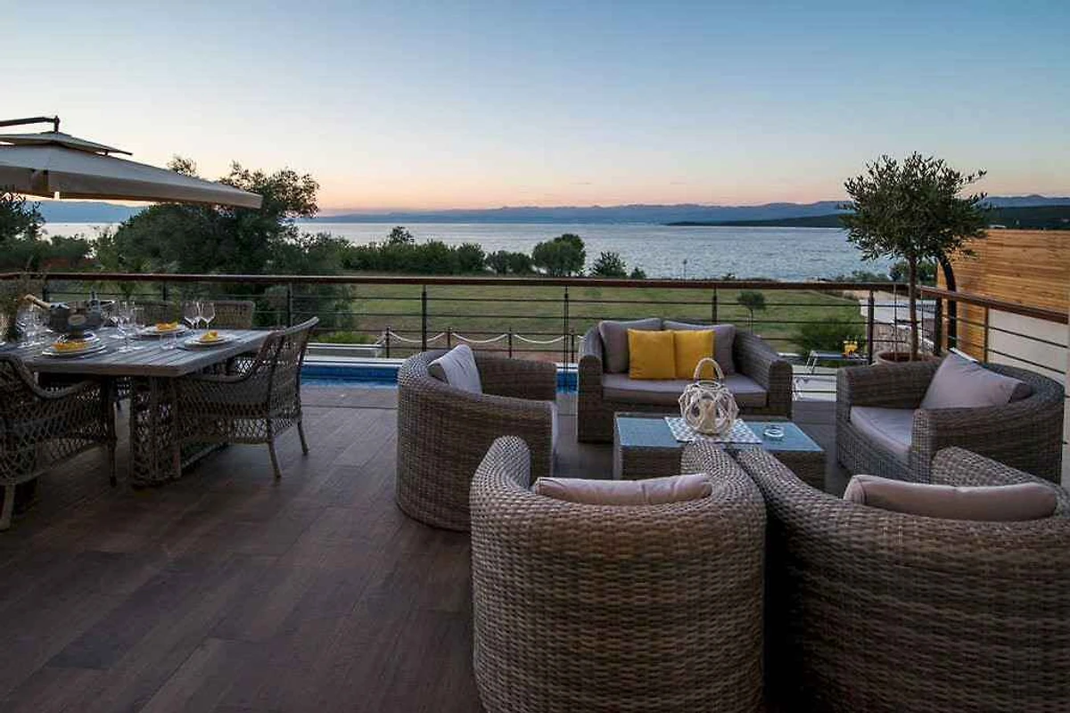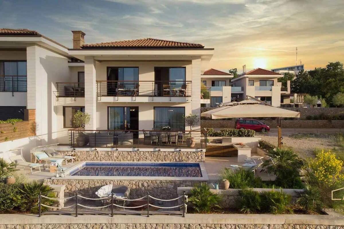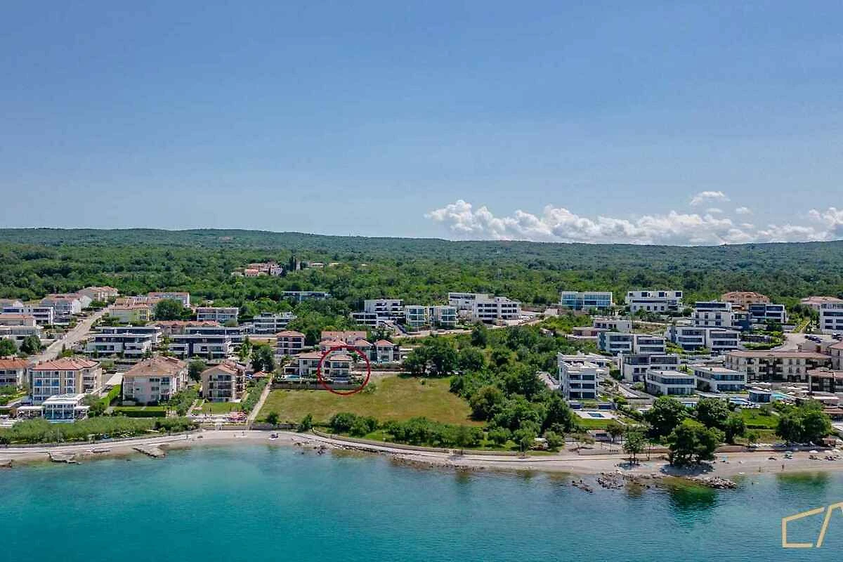 Malinska. Die Villa befindet sich auf einem geschlossenen Gartengrundstück mit Blumen, von einem Zaun begrenzt. Die Zufahrt erfolgt über einen Weg (asphaltiert).