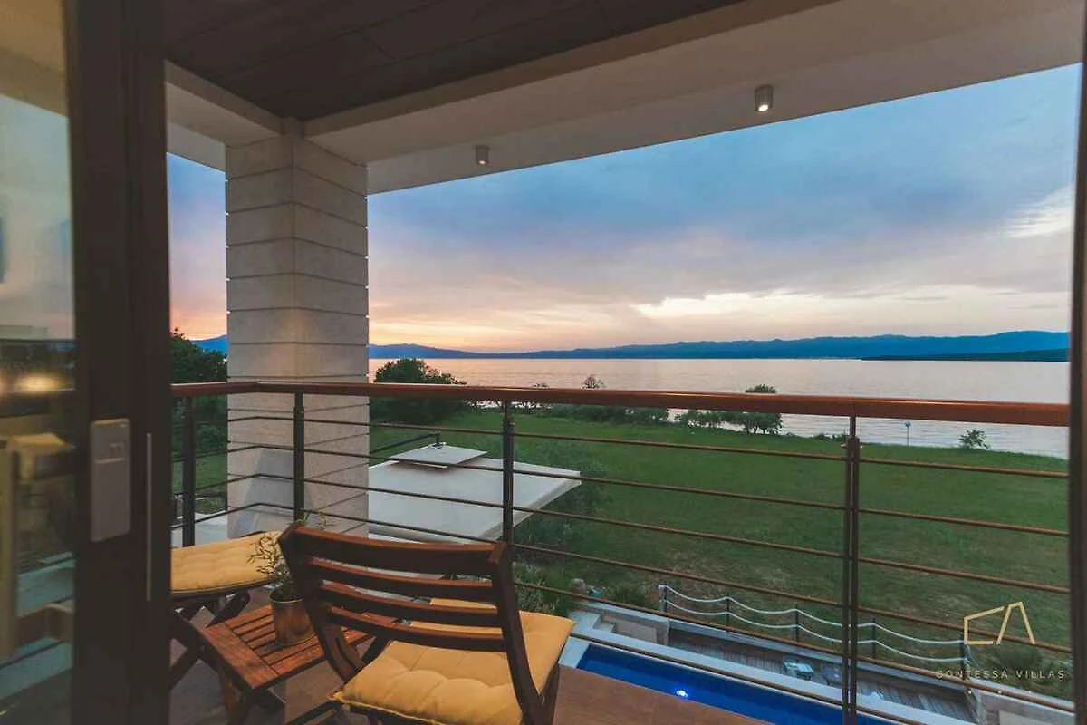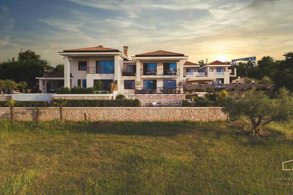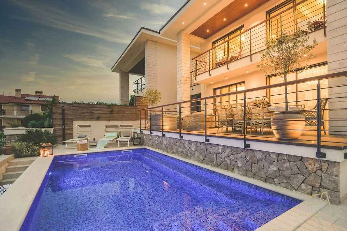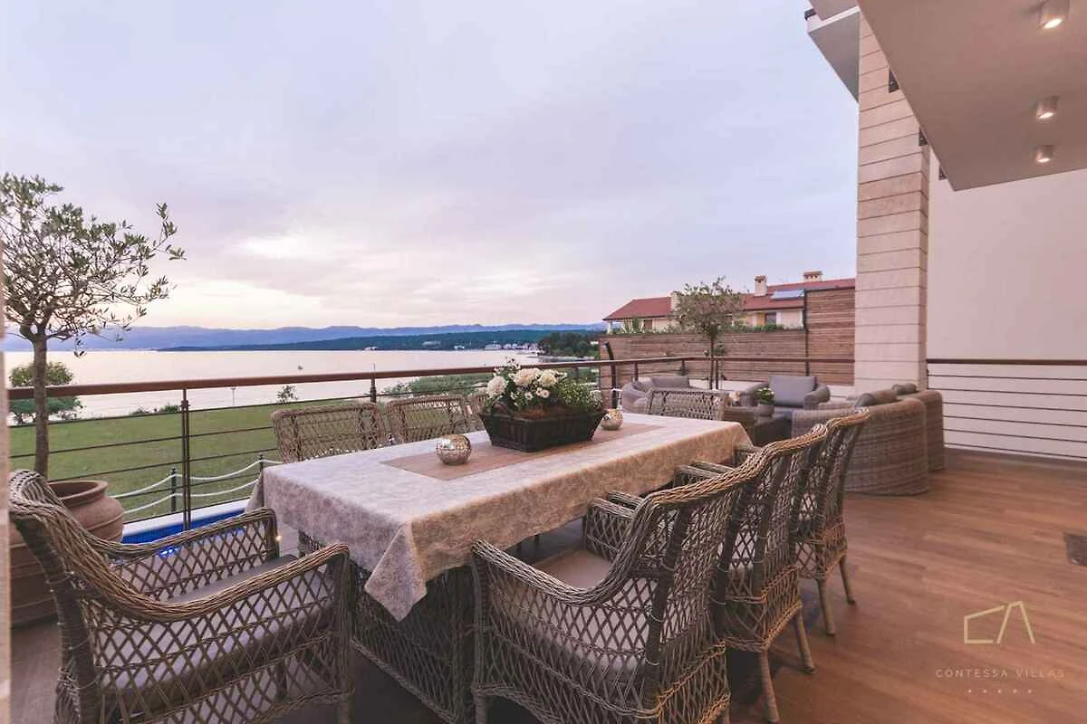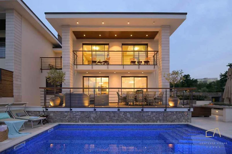 Malinska. Die Villa befindet sich auf einem geschlossenen Gartengrundstück mit Blumen, von einem Zaun begrenzt. Die Zufahrt erfolgt über einen Weg (asphaltiert).