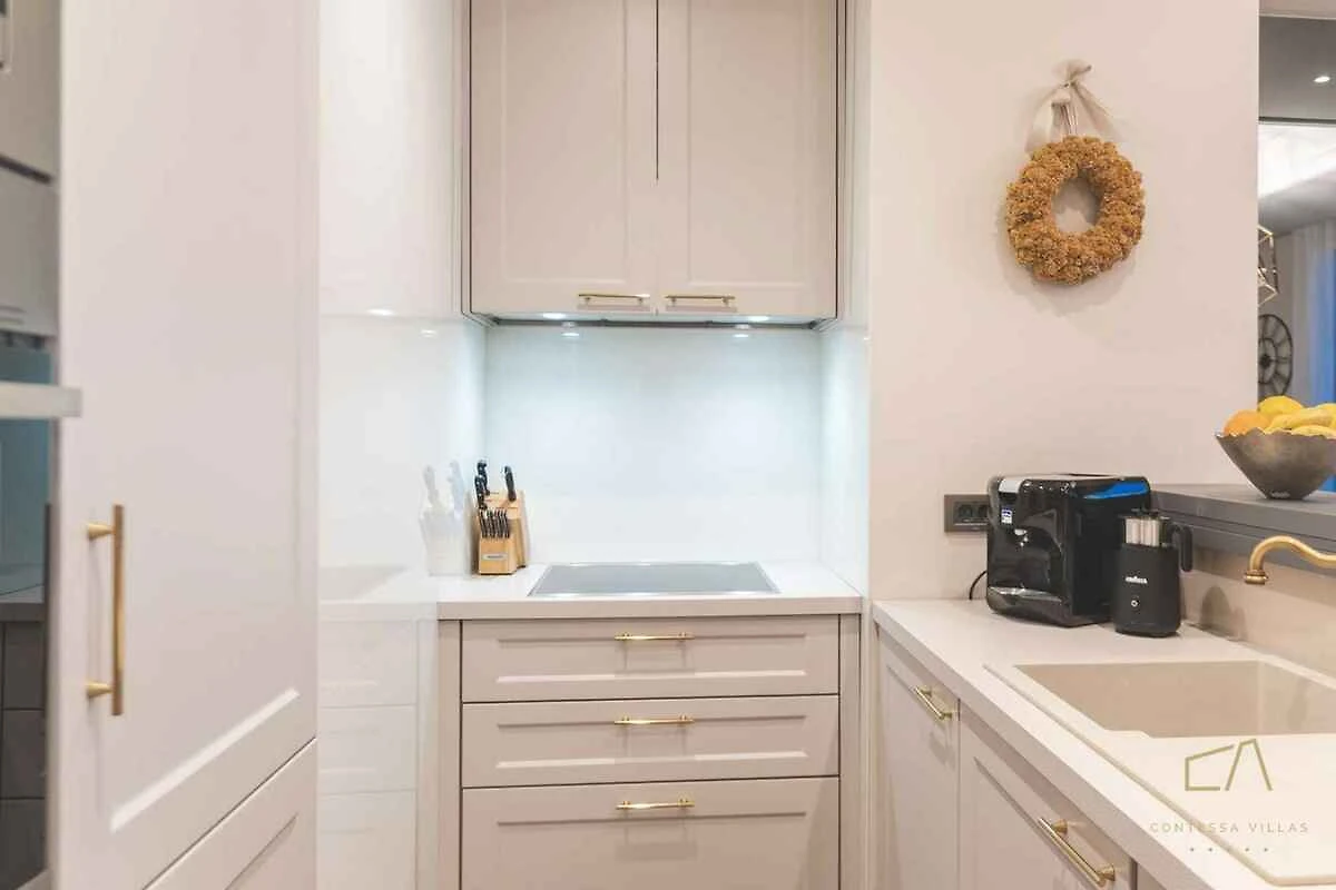 Wohnzimmer (Durchgangszimmer) mit Sitzecke, TV, Klimaanlage und Essecke. 3 Schlafzimmer jeweils mit 1 Doppelbett und Klimaanlage. Schlafzimmer mit 2 Einzelbetten und Klimaanlage. Kochecke im Wohnzimmer mit Elektroherd, Backofen, Dunstabzugshaube, Geschirrspüler, Kühlschrank (Eisfach), Mikrowelle, Kaffeemaschine, Toaster und elektrischem Wasserkocher. Bad mit Waschmaschine, Dusche, WC, Föhn und Fenster. 3 Bäder jeweils mit Dusche, WC, Föhn und Fenster.