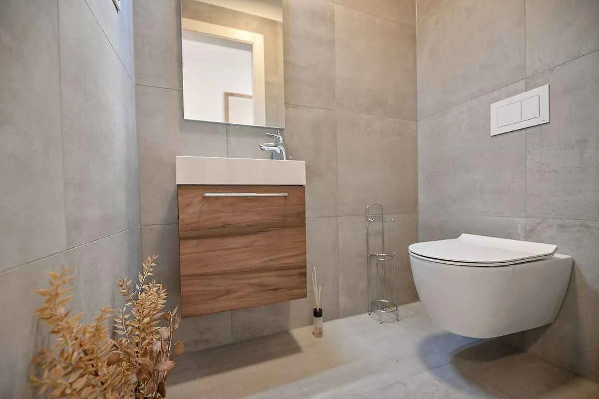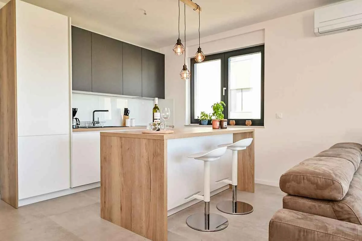 1. Etage: Wohnzimmer mit 2 Zusatzbetten auf Couch/Sofa, Sitzecke, TV, Klimaanlage, Essecke (6 Plätze) und Zugang zum Balkon (überdacht, Gartenmöbel). Schlafzimmer mit 1 Doppelbett, TV und Klimaanlage. Schlafzimmer mit 1 Doppelbett. Kochecke im Wohnzimmer mit Klimaanlage, Elektroherd (Cerankochfeld, 4 Platten), Backofen, Dunstabzugshaube, Geschirrspüler, Kühlschrank (Eisfach), Kaffeemaschine, Toaster und elektrischem Wasserkocher. Bad mit Waschmaschine, Dusche, 1 Waschbecken, WC, Föhn und Fenster.