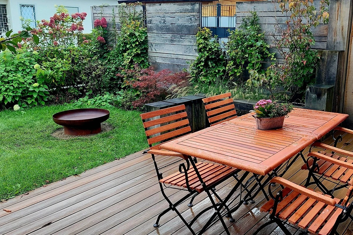 Das Haus bietet einen eigenen Garten mit Terrasse, Tisch und Stühlen sowie eine Grill- und Feuerschale für gesellige Abende.