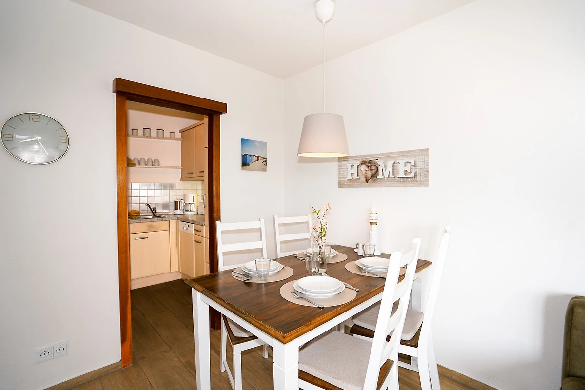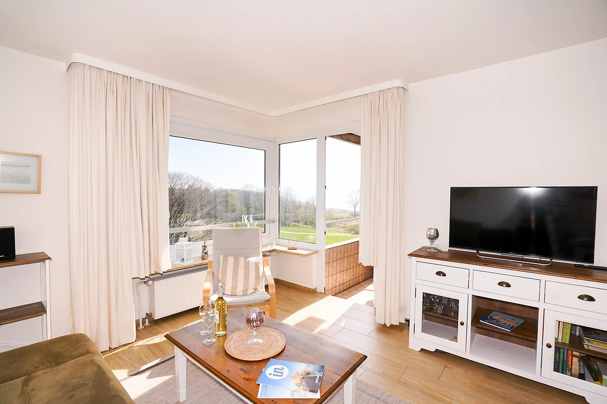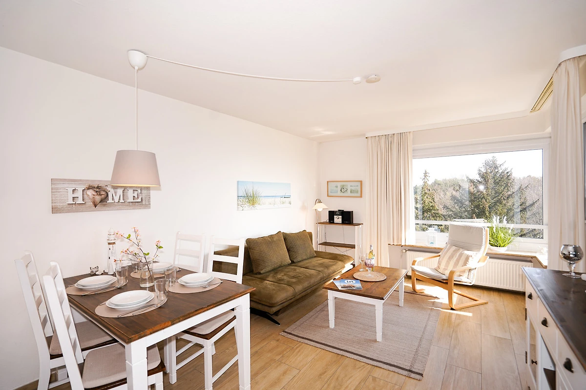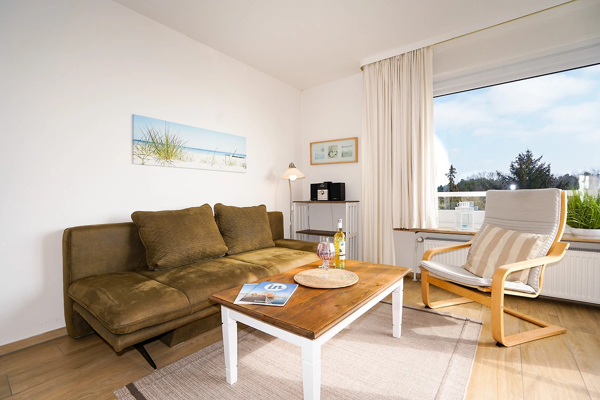 Das gemütlich eingerichtete Wohnzimmer verfügt über eine Schlafcouch für zwei Personen, einen Fernseher, einen Sessel und einen Esstisch mit vier Stühlen. Erholen Sie sich nach einem aufregenden Urlaubstag auf dem eigenen Balkon, mit direktem Ostseeblick. Kostenloses W-LAN steht Ihnen selbstverständlich während Ihres Aufenthaltes zur Verfügung.
