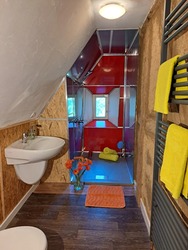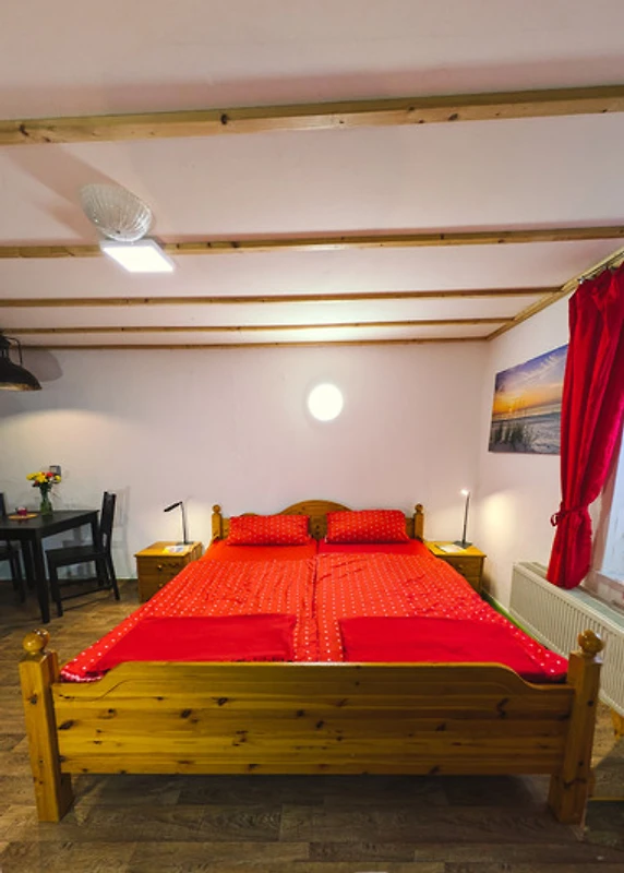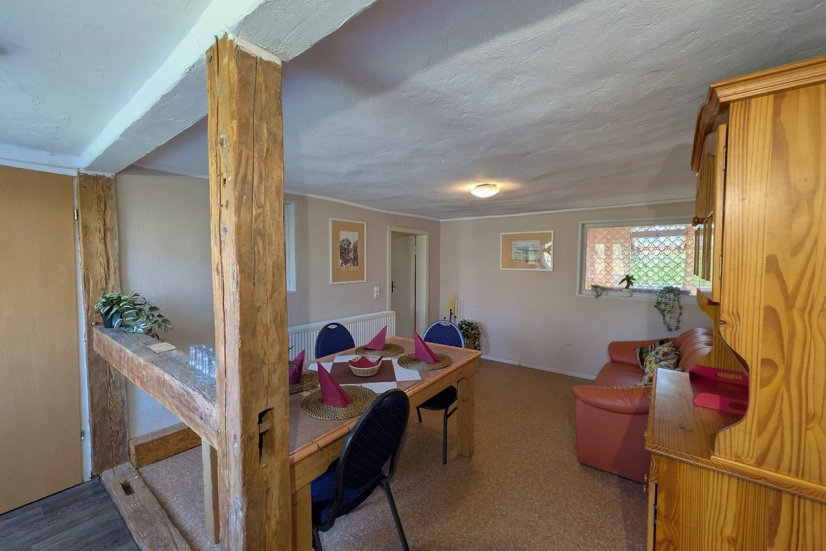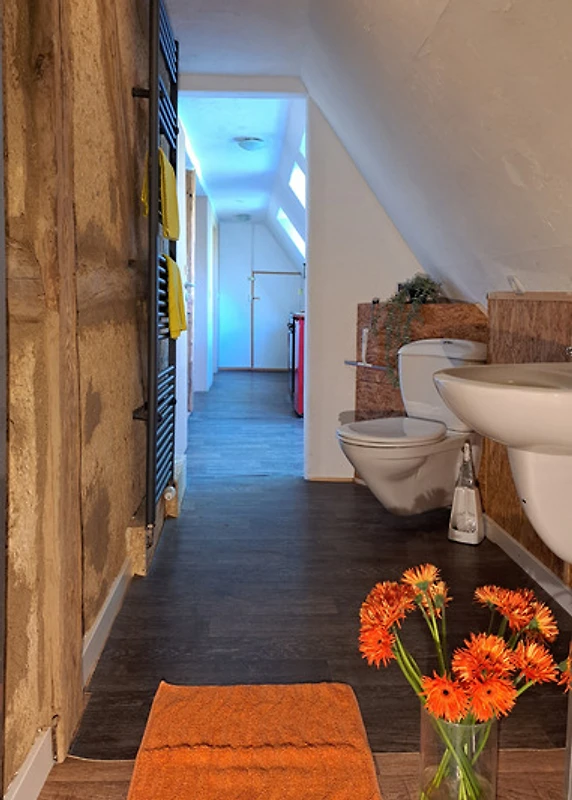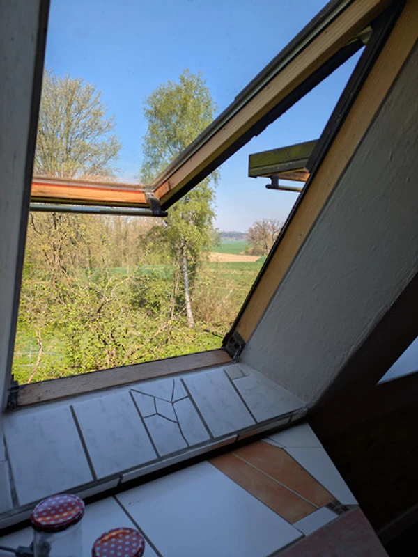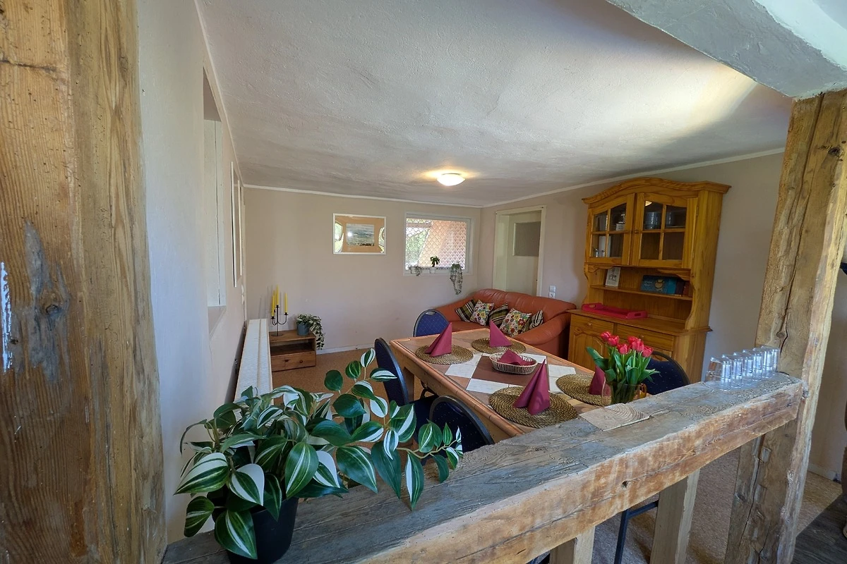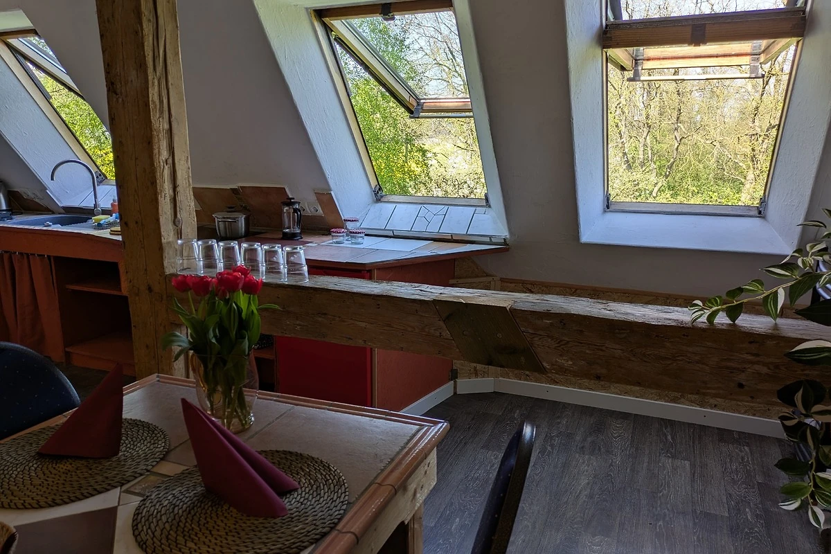 Wir lieben das Echte: Lehm, Holz, Wind und Licht. Die Wohnung wurde in Eigenarbeit ausgebaut – jede Wand, jeder Balken erzählt ein Stück davon. Der Grillplatz mit Panoramablick ist nur für unsere Gäste.