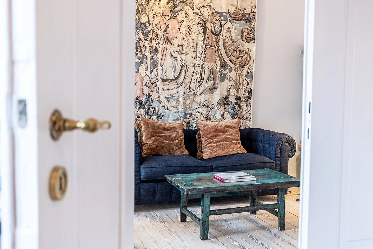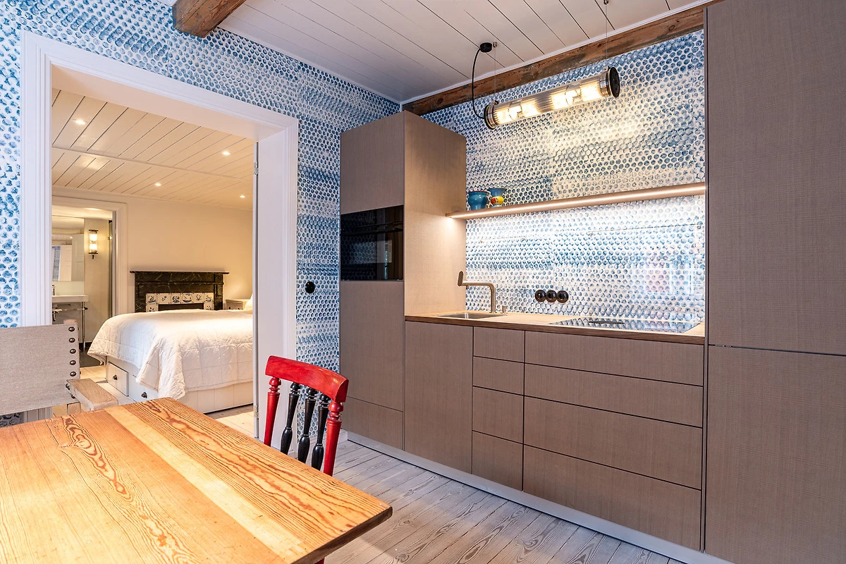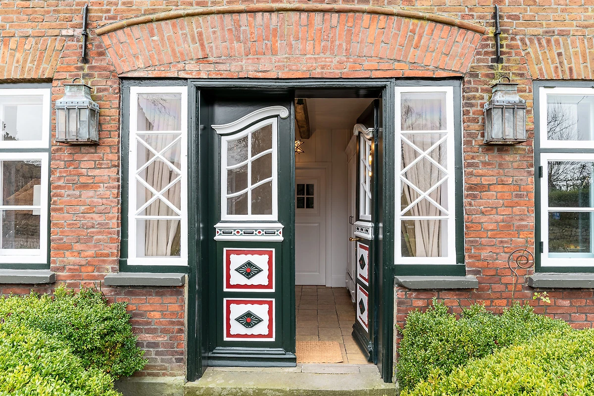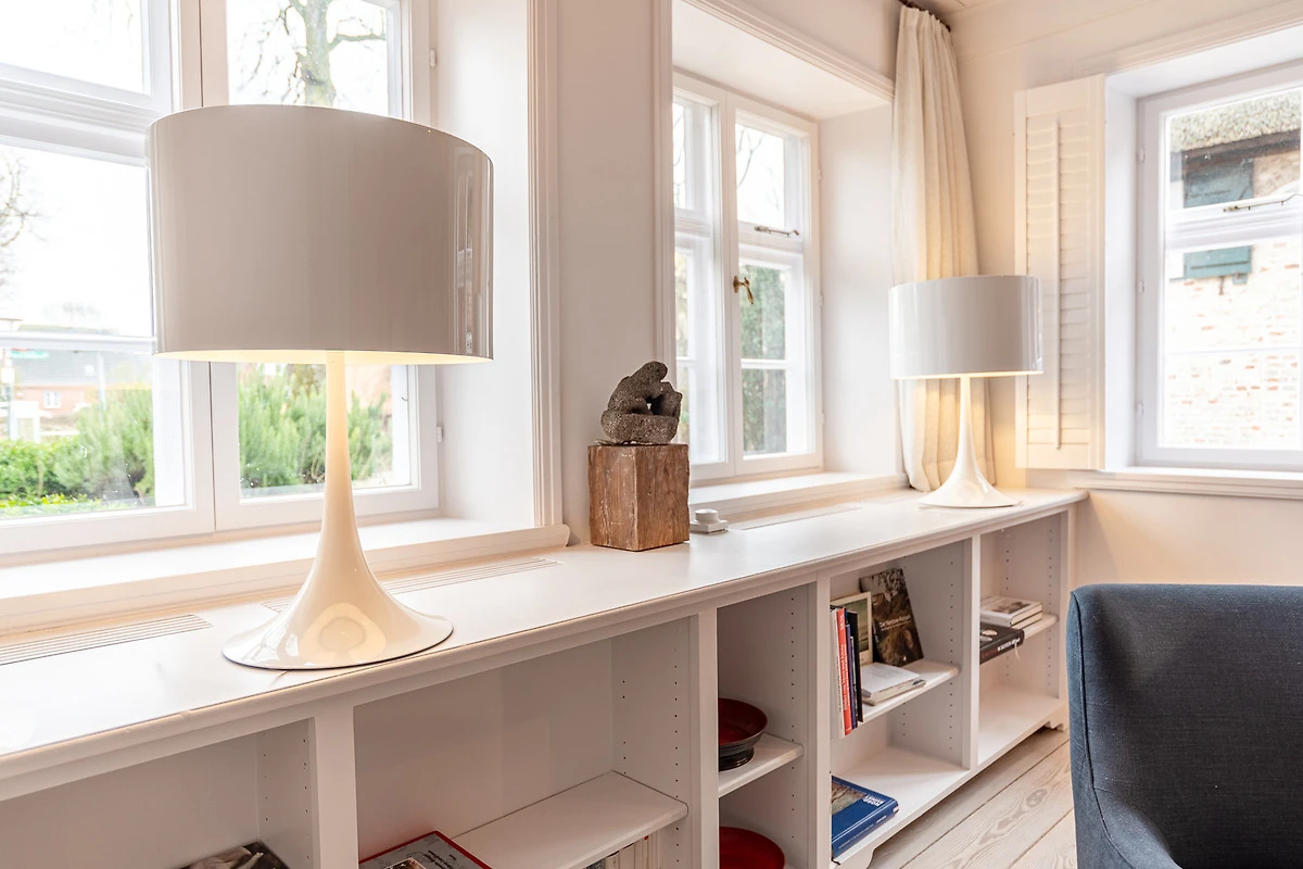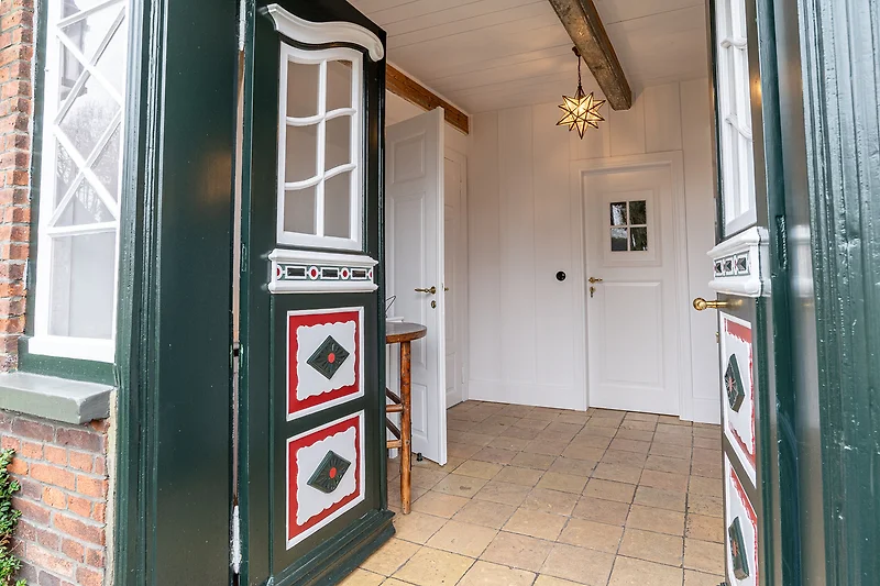 Die kleinere Sönnes Stuuv mit 60qm wird durch den alten Haupteingang des Hauses betreten. Dem grosszügigen Eingangsbereich schliesst sich das mit bequemen Sitzmöbeln ausgestattete Wohnzimmer an. In der vollausgestatteten Küche bietet sich der Küchentisch zum ausgiebigen Speisen, Zeitung lesen, langen Gesprächen an. Das Schlafzimmer ist mit einem grossen äusserst bequemen Bett und viel Stauraum ausgestattet. Daran anschliessend befindet sich das geräumige, moderne Bad, von dem aus sich eine Blickachse durch die gesamte Wohnung , durch das Fenster über Hunderte von Metern in die Allee vor dem Haus eröffnet. Hervorzuheben ist auch hier die stilsichere Ausstattung sowie wiederum Gemälde des Nieblumer Malers Fritz Chors (1884 - 1962). Zum Verweilen lädt auch eine Sitzecke vor dem Haus ein.