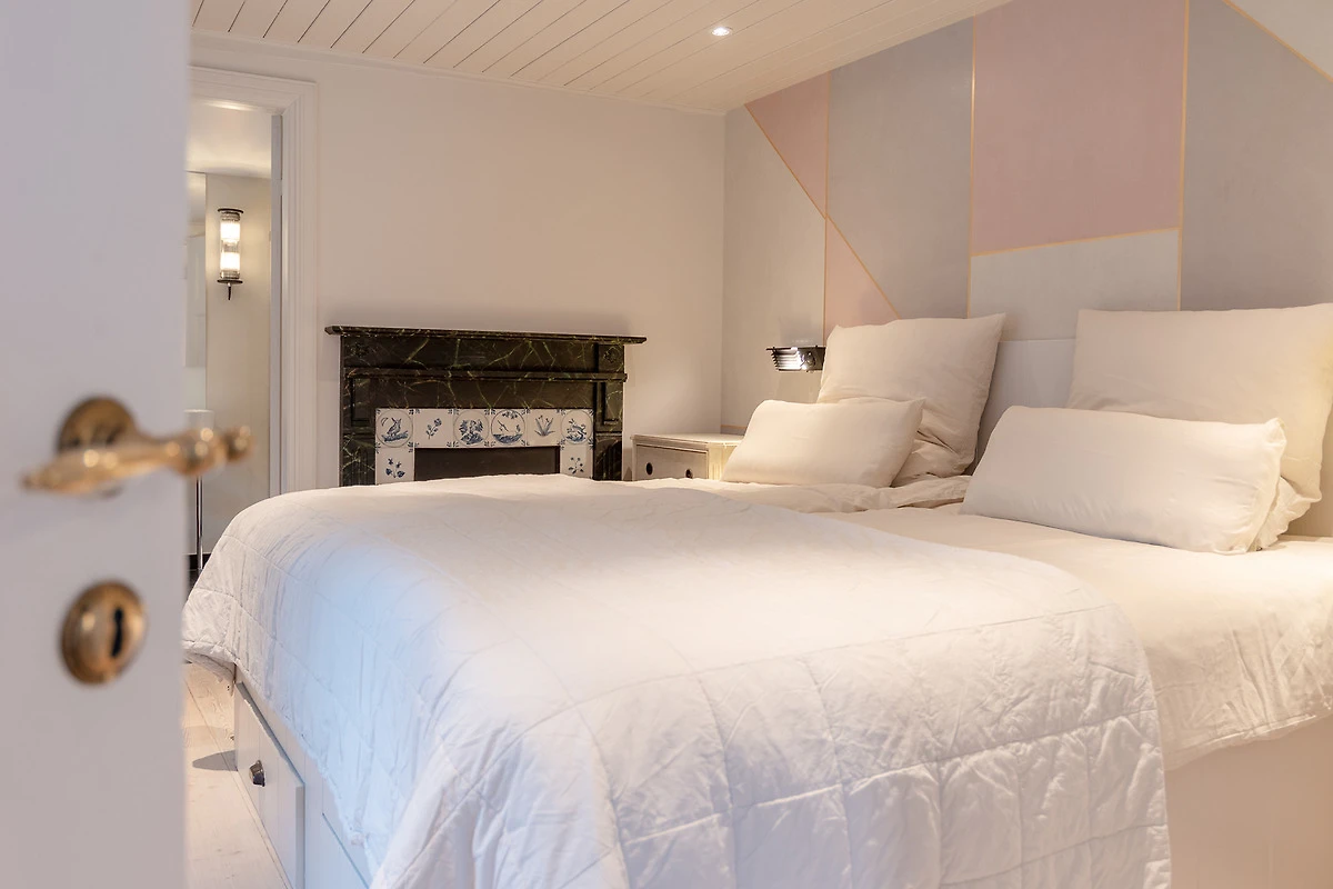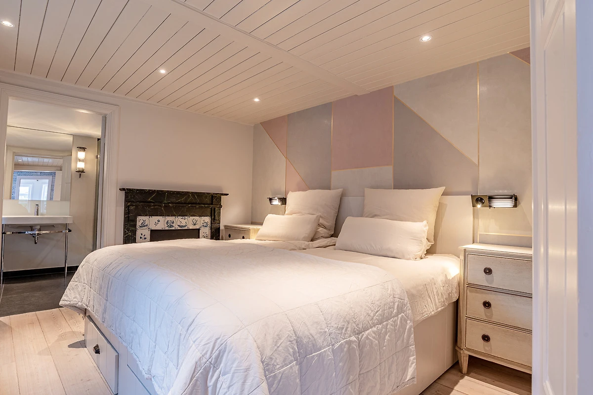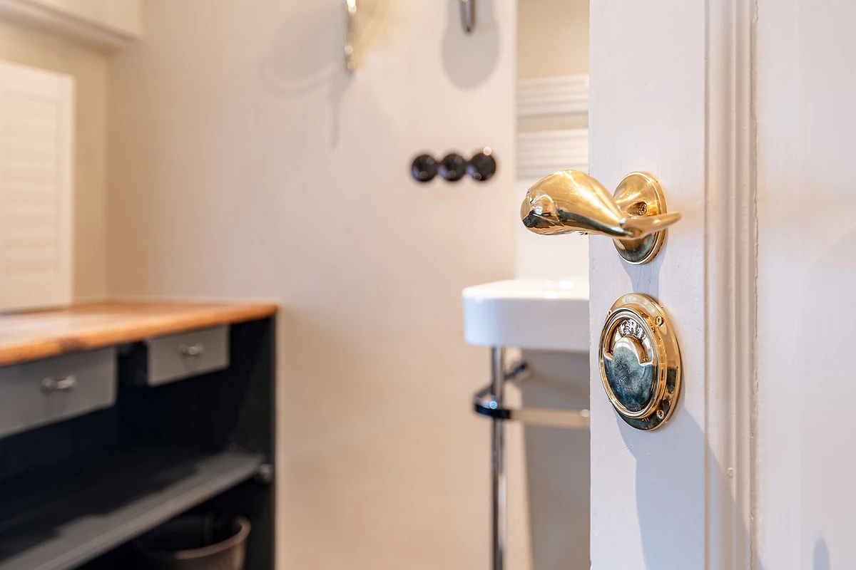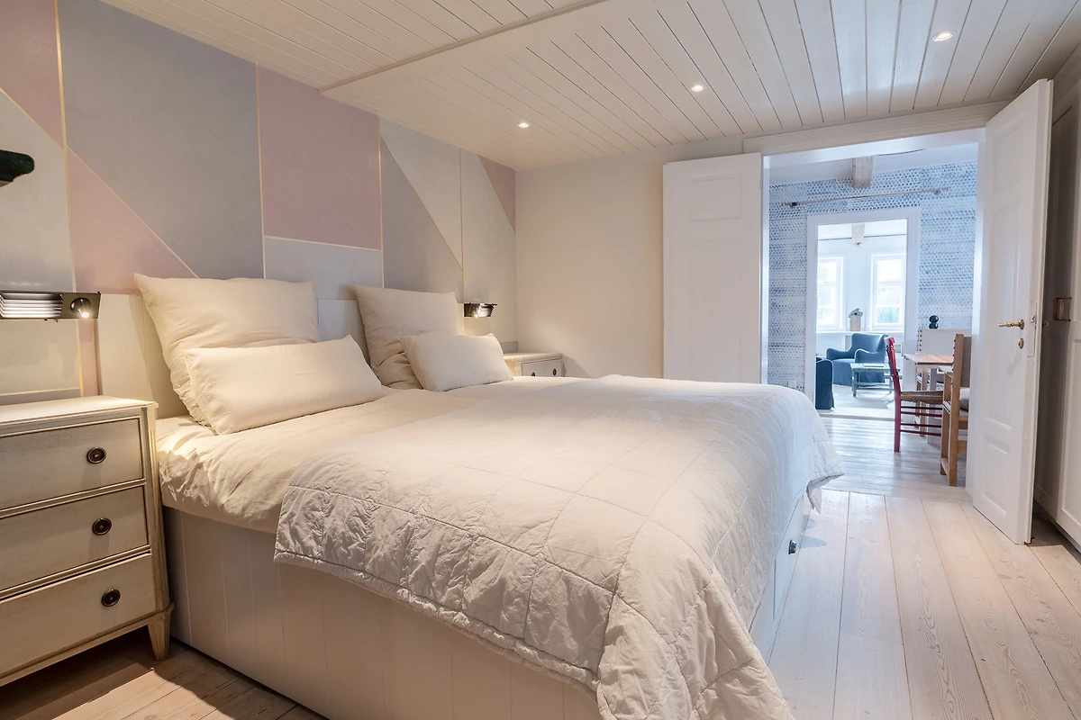 Die kleinere Sönnes Stuuv mit 60qm wird durch den alten Haupteingang des Hauses betreten. Dem grosszügigen Eingangsbereich schliesst sich das mit bequemen Sitzmöbeln ausgestattete Wohnzimmer an. In der vollausgestatteten Küche bietet sich der Küchentisch zum ausgiebigen Speisen, Zeitung lesen, langen Gesprächen an. Das Schlafzimmer ist mit einem grossen äusserst bequemen Bett und viel Stauraum ausgestattet. Daran anschliessend befindet sich das geräumige, moderne Bad, von dem aus sich eine Blickachse durch die gesamte Wohnung , durch das Fenster über Hunderte von Metern in die Allee vor dem Haus eröffnet. Hervorzuheben ist auch hier die stilsichere Ausstattung sowie wiederum Gemälde des Nieblumer Malers Fritz Chors (1884 - 1962). Zum Verweilen lädt auch eine Sitzecke vor dem Haus ein.