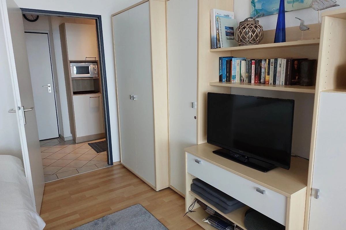Im Wohnschlafraum befindet sich ein Doppelbett (160x200), eine gemütliche Sitzgarnitur für 4 Personen, TV, Radio, Schrank. Am runden Esstisch mit Blick auf die Ostsee finden bis zu 4 Personen Platz.
