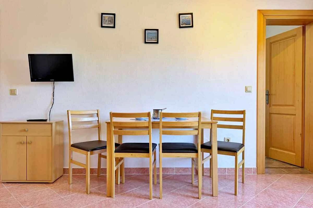 Der Eingang in Ihre Ferienwohnung befindet sich in der 2. Etage. Wohnküche mit Sitzecke, TV und Zugang zum Balkon (Gartenmöbel, Sonnenschirm). Schlafzimmer mit 2 Einzelbetten. Schlafzimmer mit 1 Doppelbett. Kochnische in der Wohnküche mit Essecke, Elektroherd, Kühlschrank (Eisfach), Kaffeemaschine und elektrischem Wasserkocher. Bad mit Dusche, WC und Föhn.