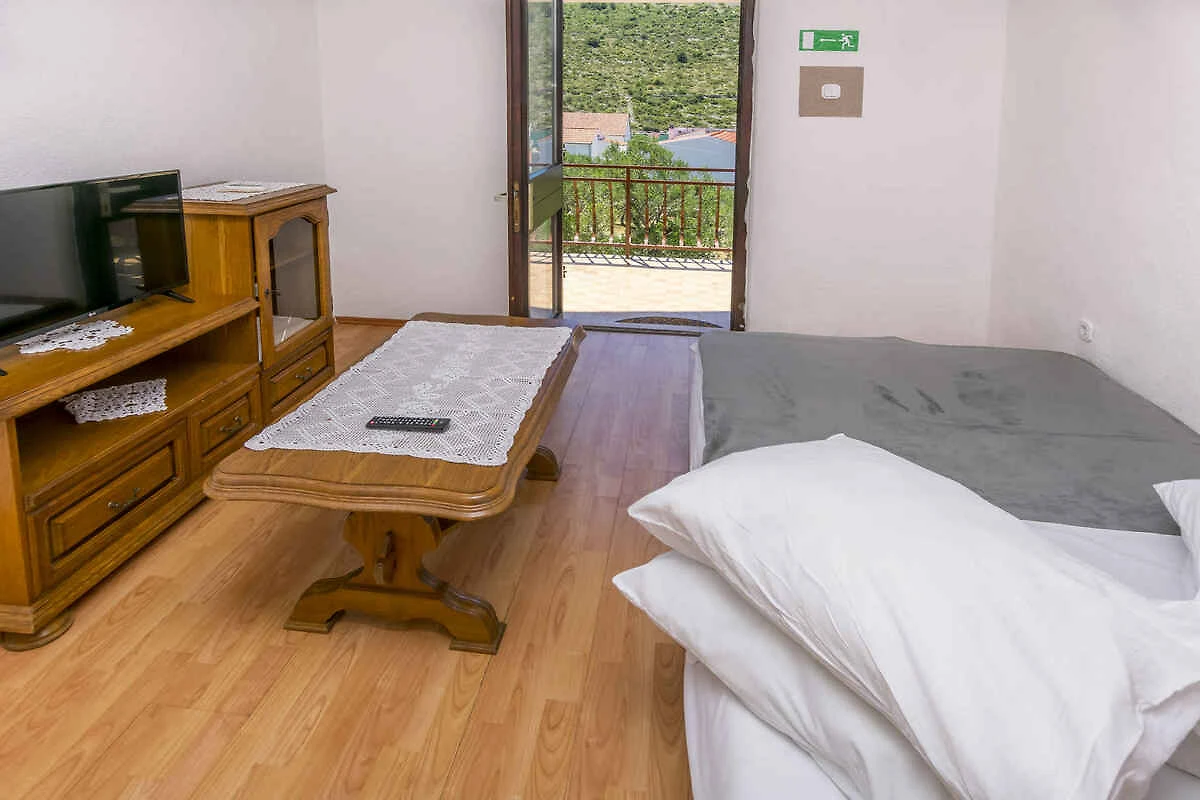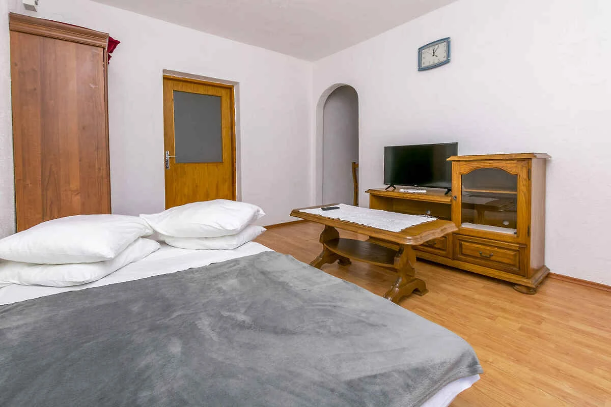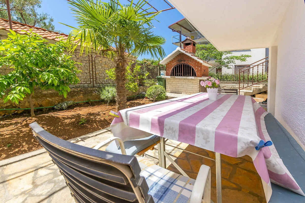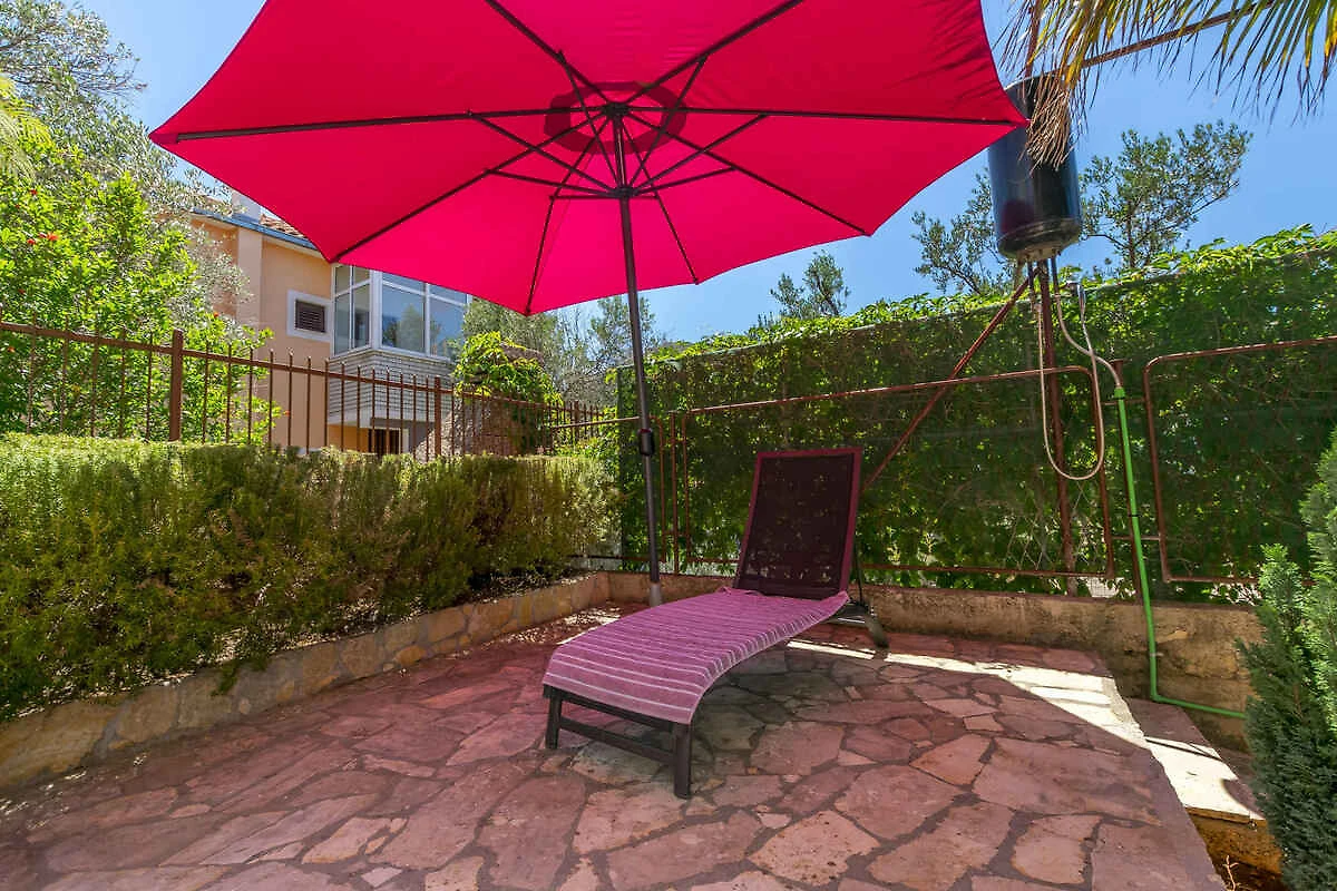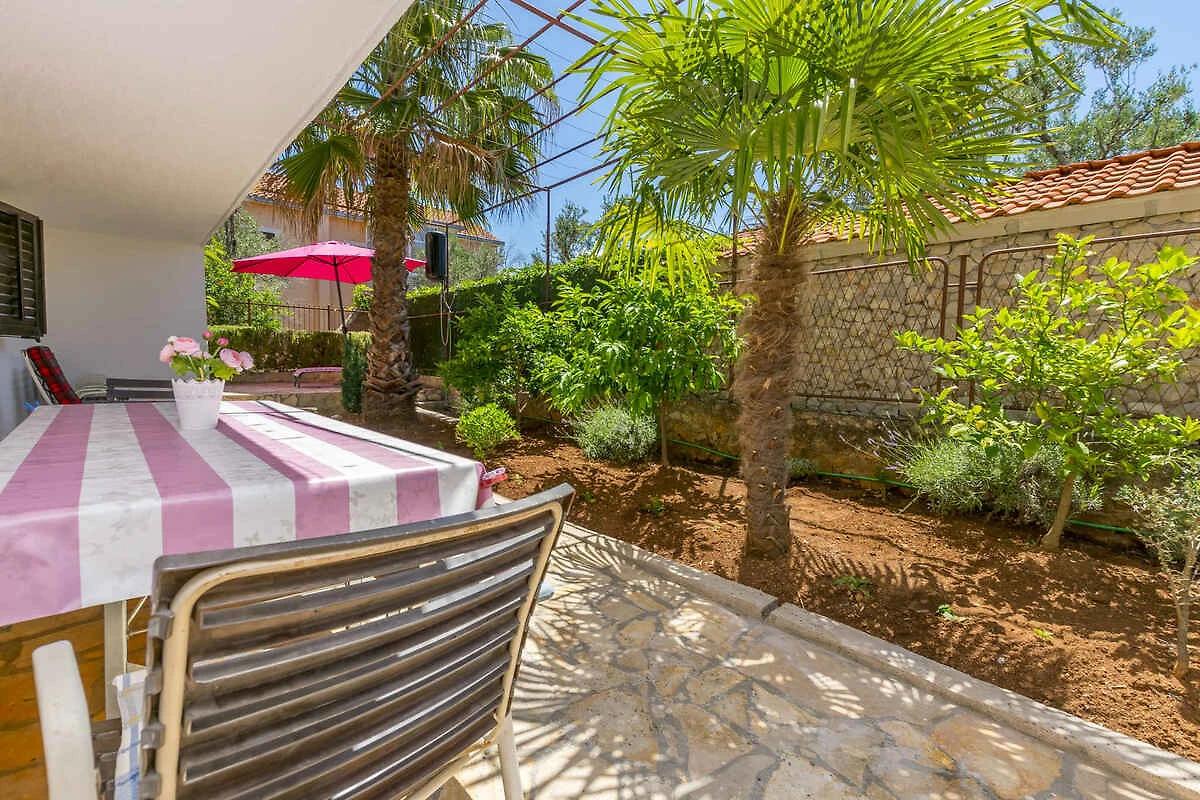 Rogoznica. Die Ferienwohnung befindet sich auf einem geschlossenen Gartengrundstück mit Wiese, Blumen und Sträuchern. Der Vermieter wohnt im Haus. Die Zufahrt erfolgt über eine Nebenstrasse. Parkplatz auf dem Grundstück und der Strasse vor dem Haus.