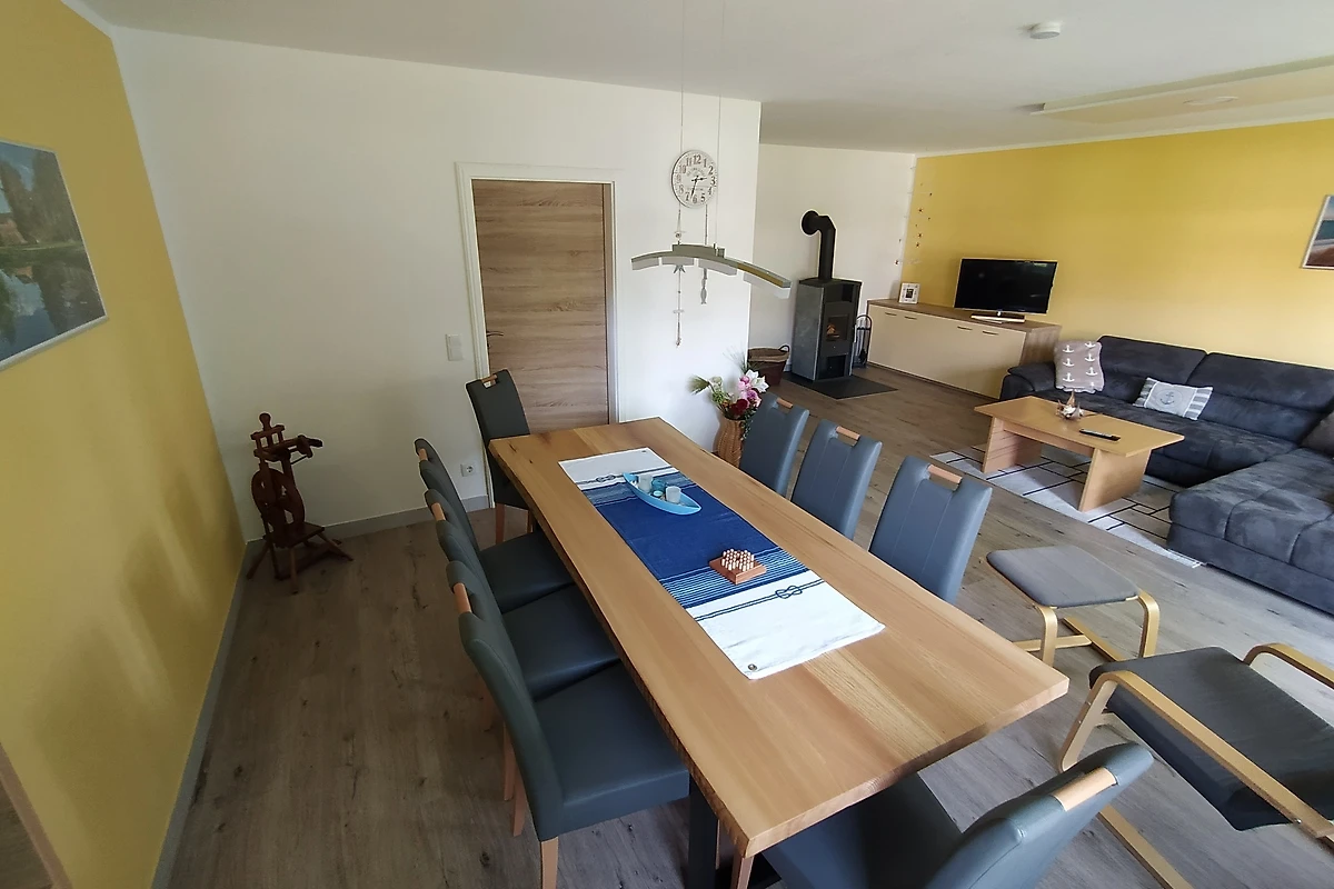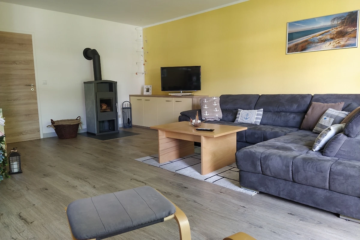 Der großzügige Wohnbereich im EG mit Kamin lädt zu entspannten Abenden ein. Die voll ausgestattete Küche mit Geschirrspüler, Mikrowelle,
