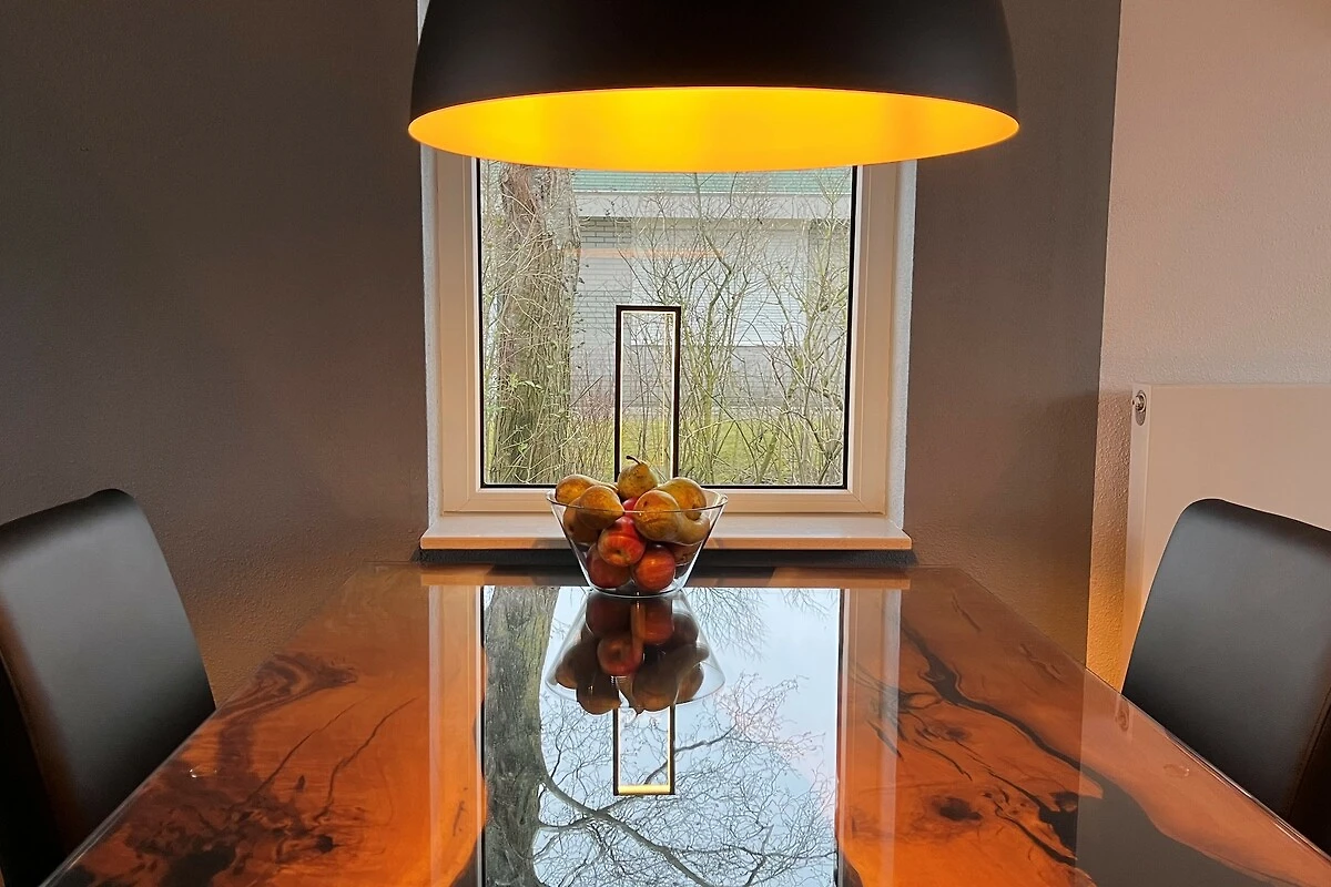 Das lichtdurchflutete Wohnzimmer mit großen Panoramafenstern bietet einen herrlichen Blick aufs Wasser und direkten Zugang zur großzügigen Terrasse. Ob Frühstück im Freien, ein Glas Wein beim Sonnenuntergang oder einfach entspannte Stunden mit Blick aufs Wasser – hier ist Erholung garantiert.