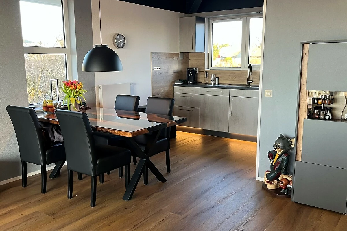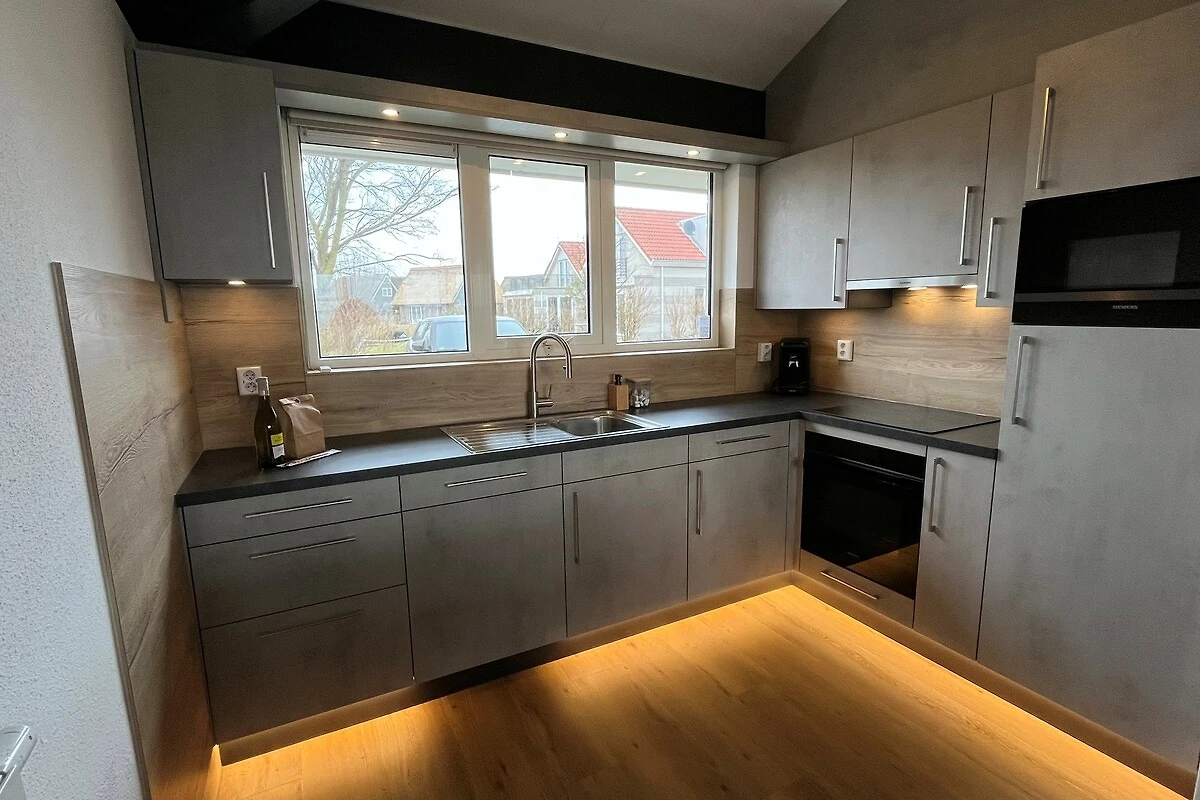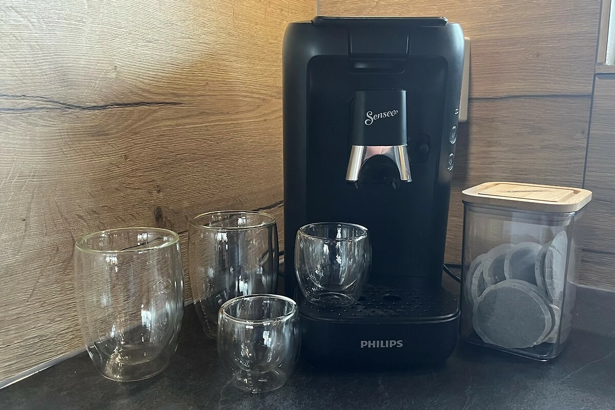 Die Küche ist komplett ausgestattet mit einer Küchenzeile inkl. Backofen und Mikrowelle, Induktionsherd, Geschirrspülmaschine, Wasserkocher, Toaster, Kaffeemaschine und Senseo-Padmaschine, Milchaufschäumer und Saftpresse. Geschirr, Gläser, Kochutensilien usw. sind umfangreich vorhanden.