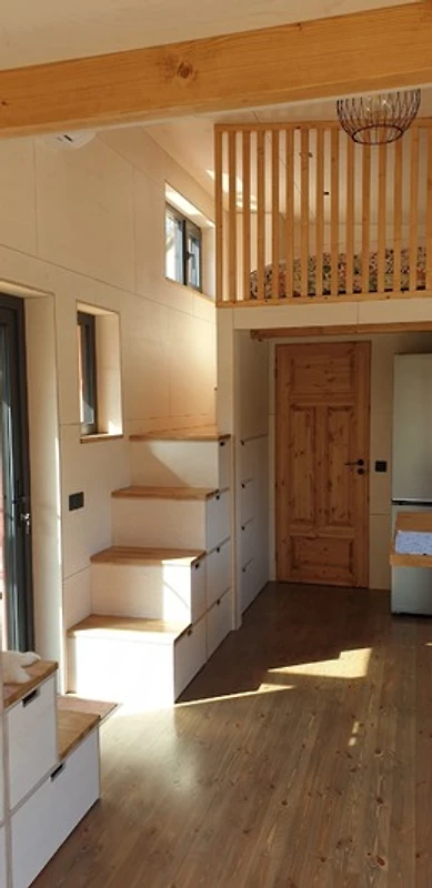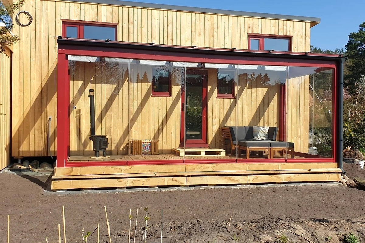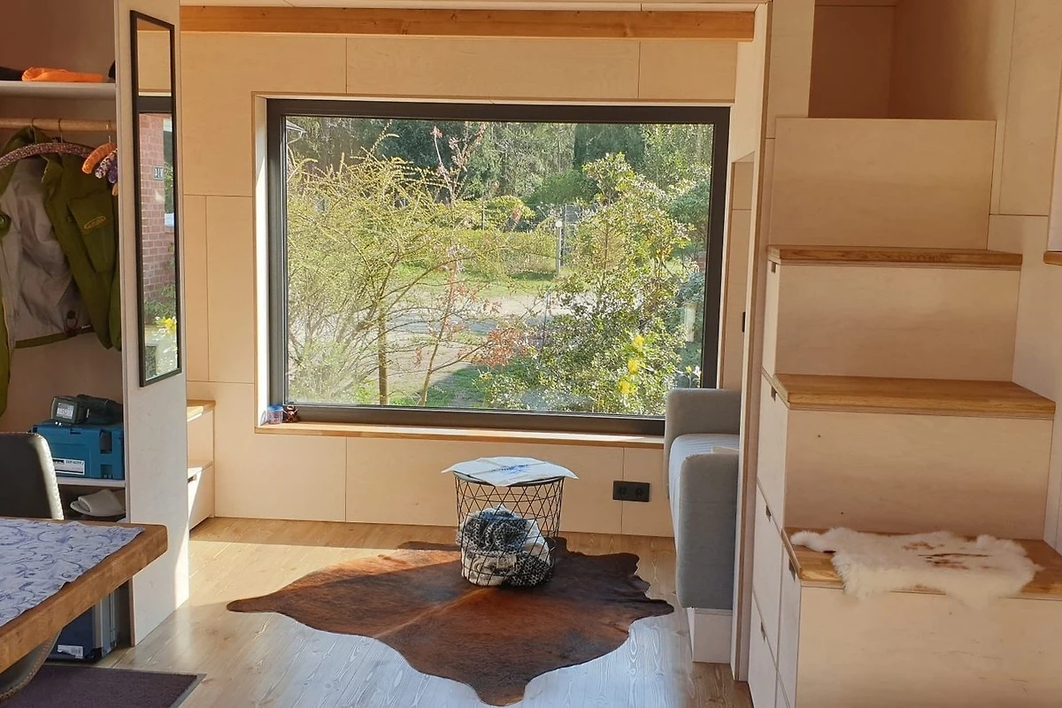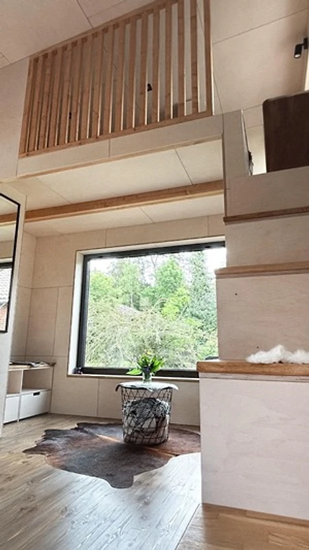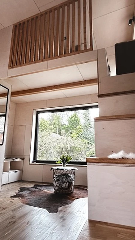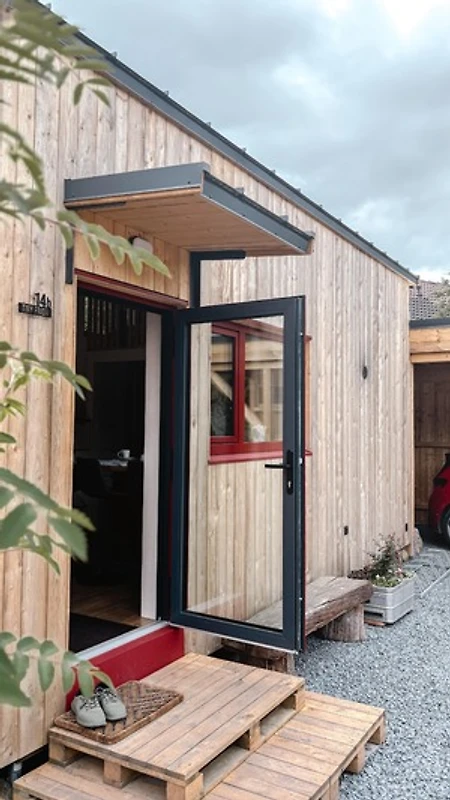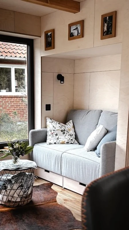 Mit viel Liebe zum Detail stilvoll eingerichtet, bietet das Tiny House auf kompakter Fläche ein durchdachtes Wohnkonzept für bis zu zwei Personen. Grosse Fenster und ein gemütlicher Wintergarten schaffen eine lichtdurchflutete Atmosphäre und eröffnen den Blick ins Grüne.