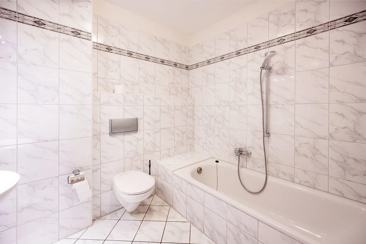 Das Badezimmer beinhaltet eine Dusch-Badewanne, ein Waschbecken, WC und einen Föhn.