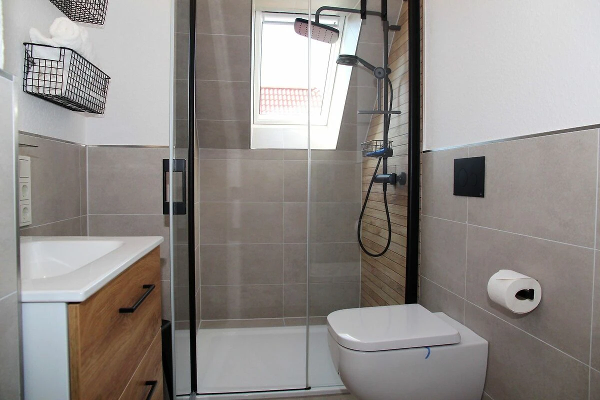 Das Huus Fernleaf bietet insgesamt drei einladende Schlafzimmer, die jeweils mit TV (Zattoo Premium, kostenfrei), Verdunklungsgardinen und hochwertigen Möbeln in geschmackvollen Farben ausgestattet sind. Die wichtigsten Fenster werden demnächst auch mit Fliegengittern versehen. Eines der Schlafzimmer mit Doppelbett befindet sich im Erdgeschoss, die anderen beiden im Obergeschoss, wovon eines zwei Einzelbetten und ein Sofa (auf Anfrage für eine siebte Person ausziehbar, dann ist jedoch der Gang zu einem Bett versperrt) bietet. Darüber hinaus gibt es pro Etage ein Badezimmer, die jeweils mit bodengleichen Duschen, Waschtisch und WC ausgestattet sind, im Erdgeschoss ist zusätzlich ein elektrischer Handtuchheizkörper vorhanden. In beiden Bädern stehen den Gästen Föhns zur Verfügung.