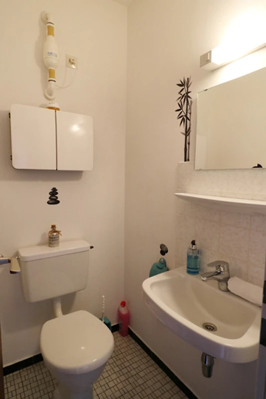 Im Bad befindet sich eine Badewanne mit Duschmöglichkeit.