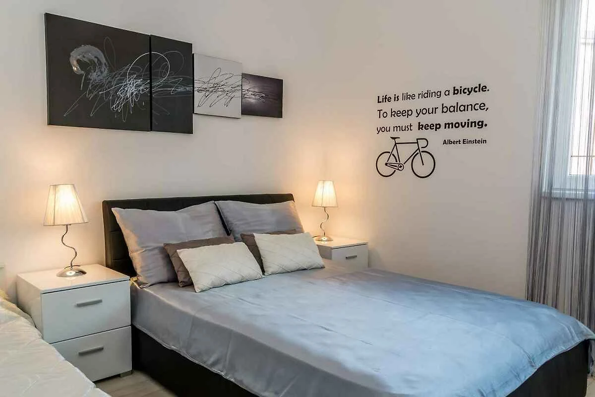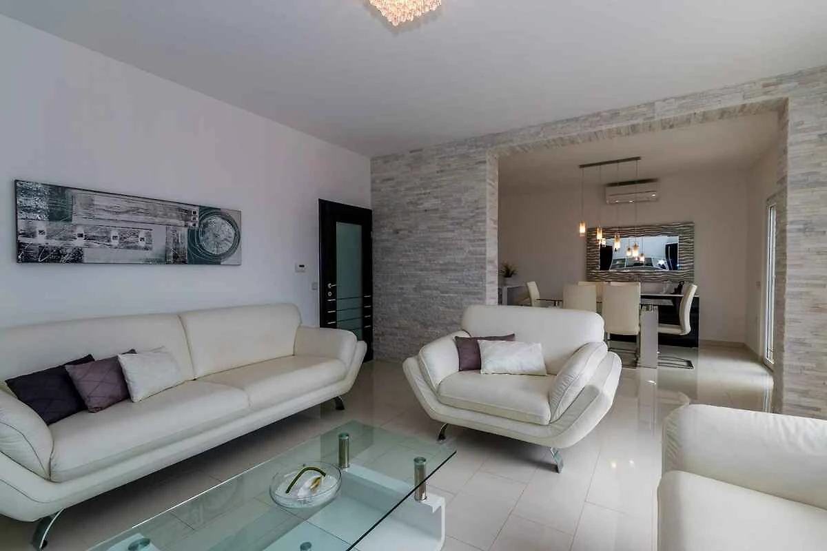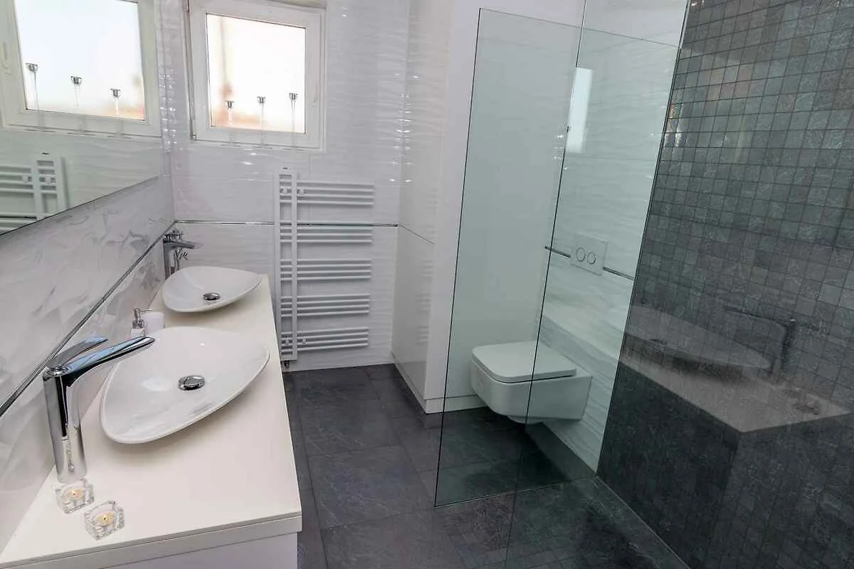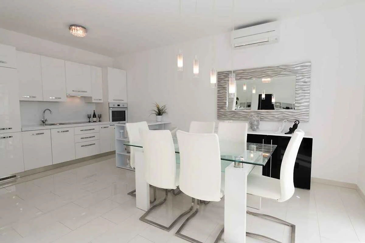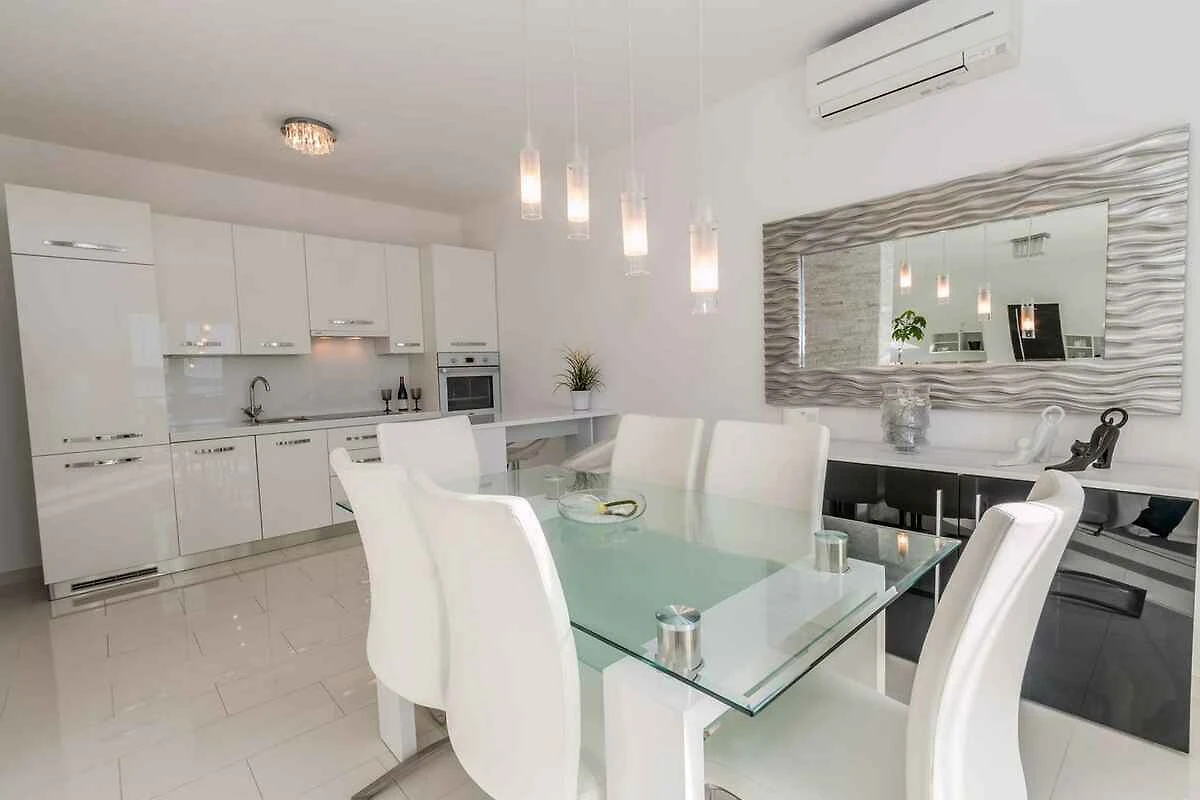 Wohnzimmer mit TV und Klimaanlage. 2 Schlafzimmer jeweils mit 1 Doppelbett. Küche mit Gasherd, Backofen, Geschirrspüler, Kühlschrank, Mikrowelle, Kaffeemaschine und Toaster. Bad mit Waschmaschine, Dusche und WC.
