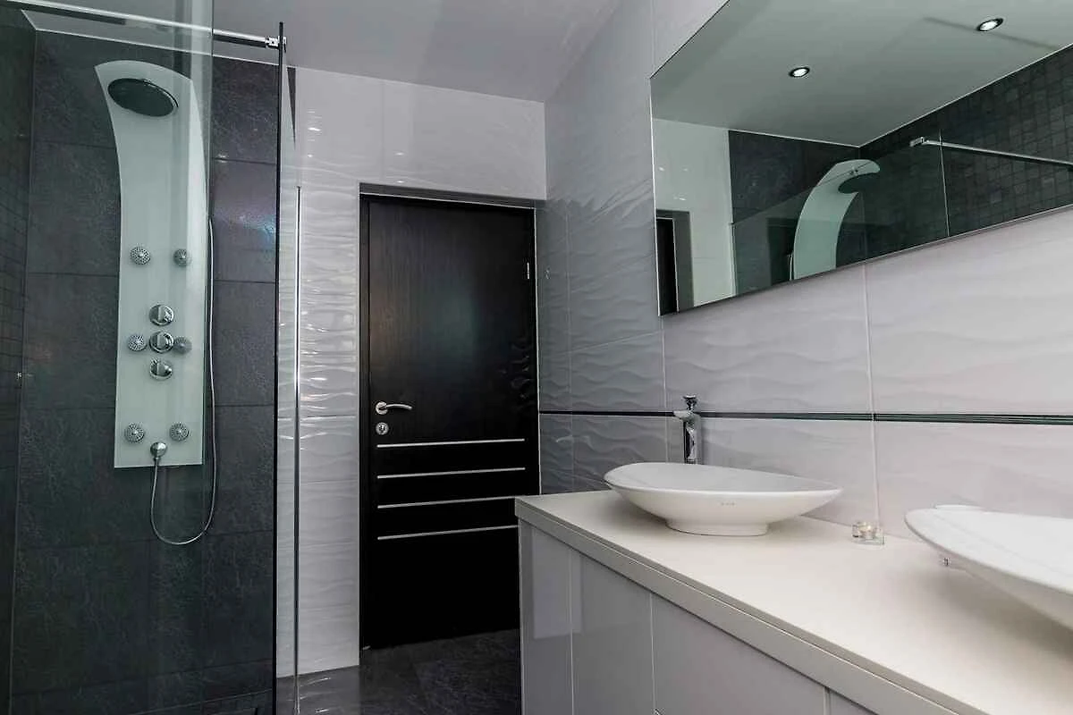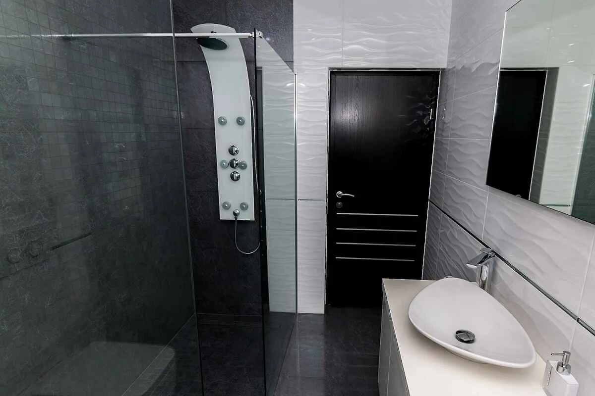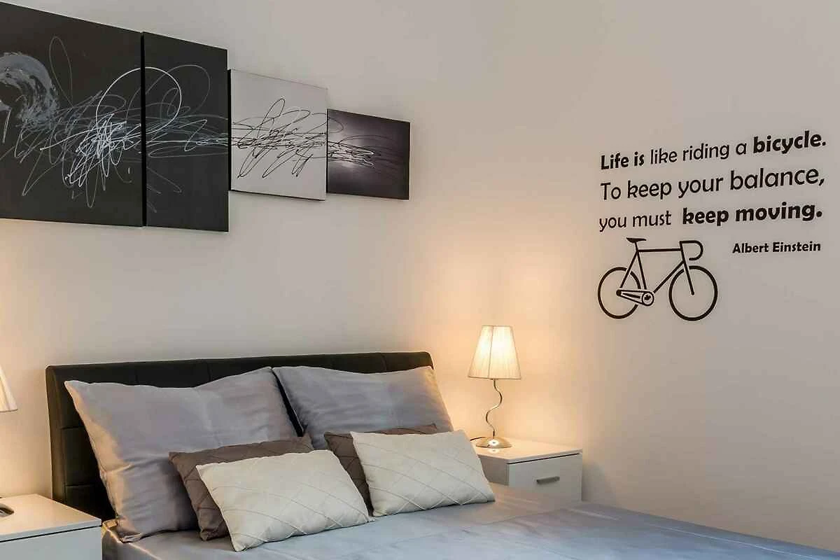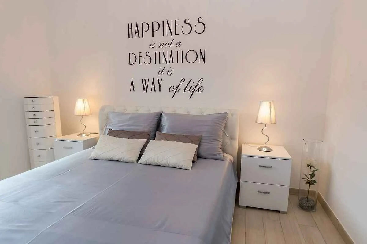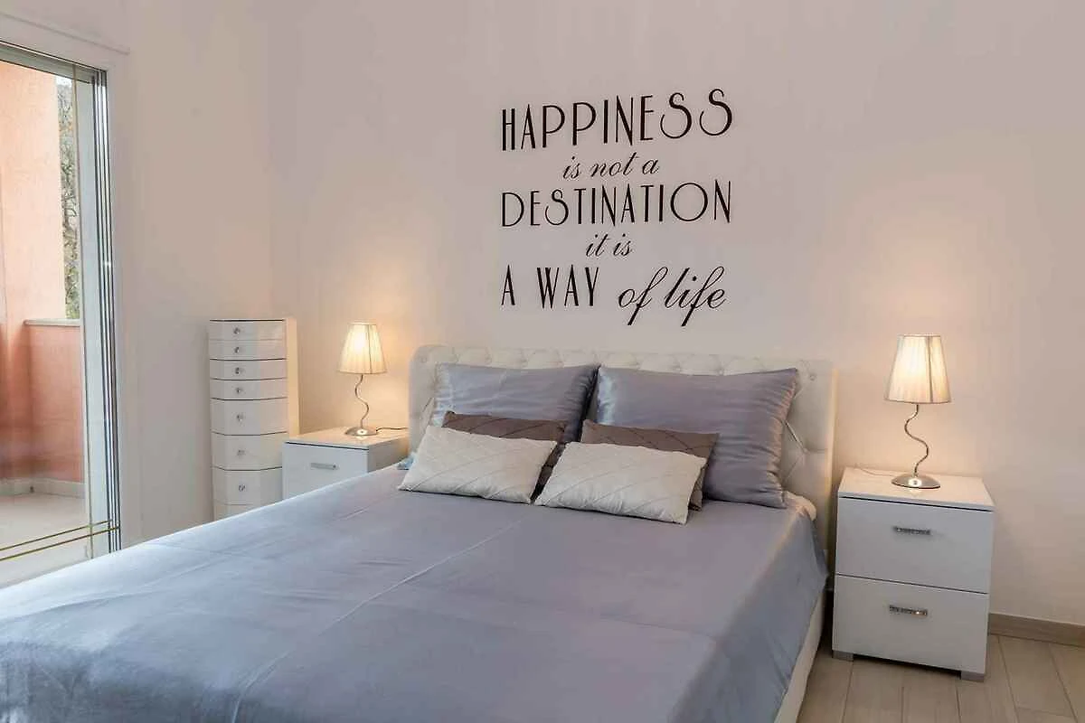 Wohnzimmer mit TV und Klimaanlage. 2 Schlafzimmer jeweils mit 1 Doppelbett. Küche mit Gasherd, Backofen, Geschirrspüler, Kühlschrank, Mikrowelle, Kaffeemaschine und Toaster. Bad mit Waschmaschine, Dusche und WC.