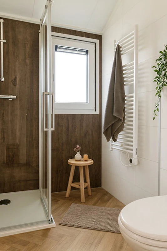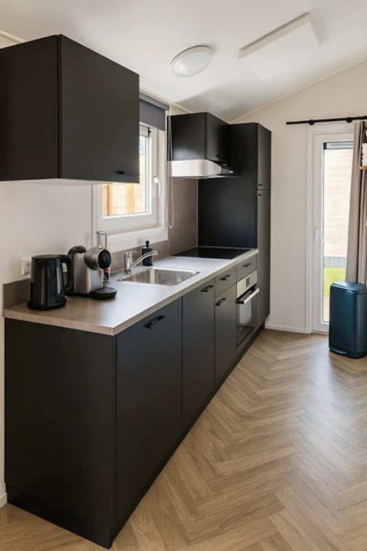 Das Chalet bietet ein helles, warmes Interieur mit gemütlicher Atmosphäre. Im Wohnzimmer gibt es große Fenster zum Garten, eine komfortable Sitzecke und Smart-TV. Der Essbereich ist für vier Personen eingerichtet, ein zusätzlicher Hocker für die fünfte Person ist vorhanden. Die offene, voll ausgestattete Küche verfügt über Induktionskochfeld, Backofen, Kombimikrowelle, Geschirrspüler, Kühlschrank, Nespresso Dolce Gusto, Wasserkocher, Stabmixer und alle wichtigen Küchenutensilien.