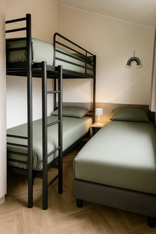 Schlafzimmer 1 hat ein Doppelbett (160 x 200 cm) und ausreichend Stauraum, Schlafzimmer 2 ist ideal für Kinder mit Etagenbett und zusätzlichem Einzelbett (80 x 200 cm). Beide Zimmer haben Verdunkelungsvorhänge und Insektenschutzgitter. Das moderne Badezimmer ist mit geräumiger Dusche, Waschbecken, Toilette, Föhn, Shampoo, Duschgel, Handseife und Handtuchheizkörper ausgestattet.